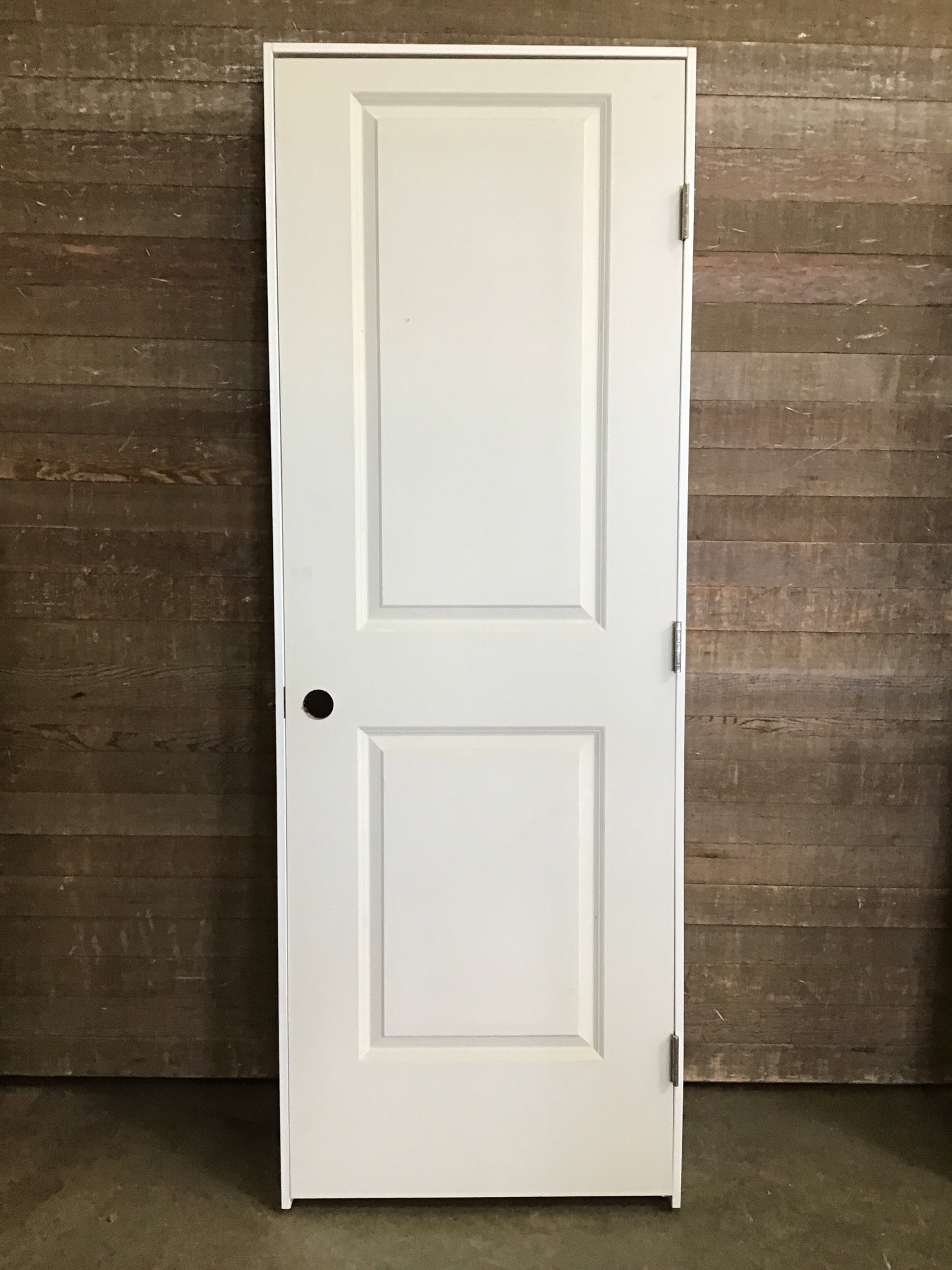 New, never installed 28" hollow core faux two raised panel door prehung in an MDF jamb. This door is primed and ready to paint the color of your choice. Left hand swing hinge cuts and a bore hole. There may be some minor cosmetic damage. Photo may be representative.