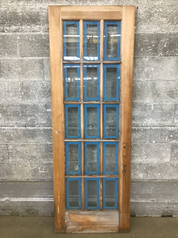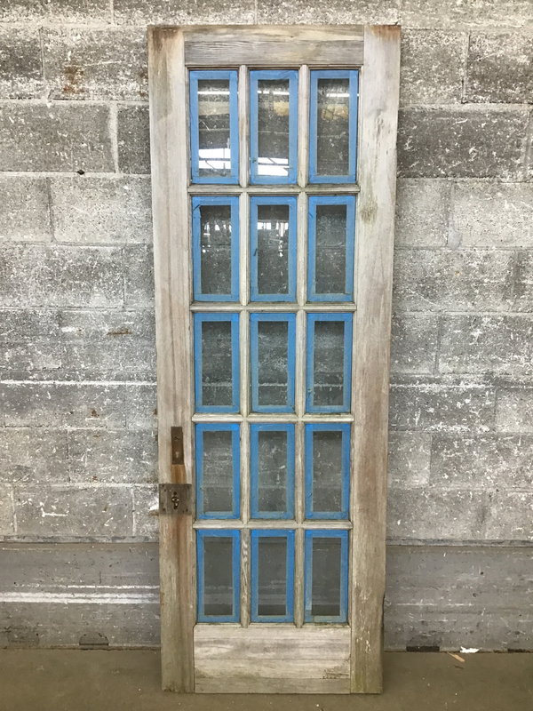 An interior French door with fifteen true-divided panes of glass sporting fir construction that shows off the beautiful Clear Vertical Grain of the lumber. The door looks to have been used as an entry door of some variety, so one side is a bit more weathered than the other, price reflects.