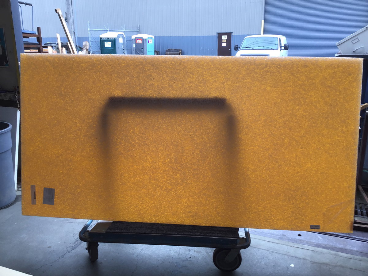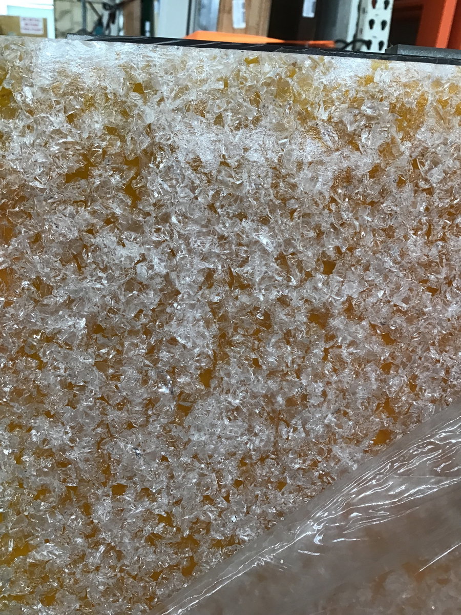 This high end 3/8” thick 48"x96" acrylic sheet in a "Crystal #1 Recycled Glass" shimmery glassy yellow pattern shines bright! It looks like it's filled with broken safety glass and it's gorgeous! It still has the plastic film on it. It’s a remnant from a commercial project, produced by Lumicor. This sheet retails for over $2100, but you can get it for a fraction of the cost. Photo may be representational.