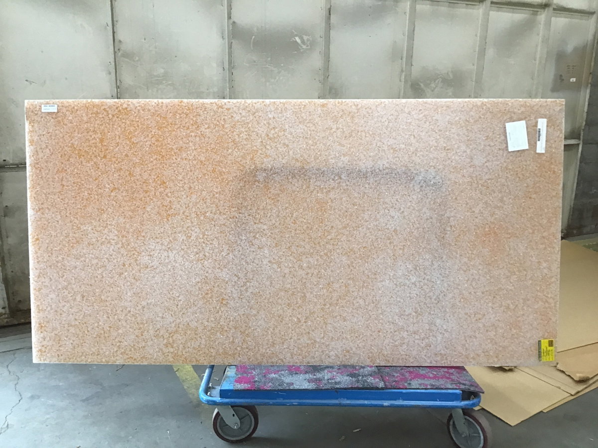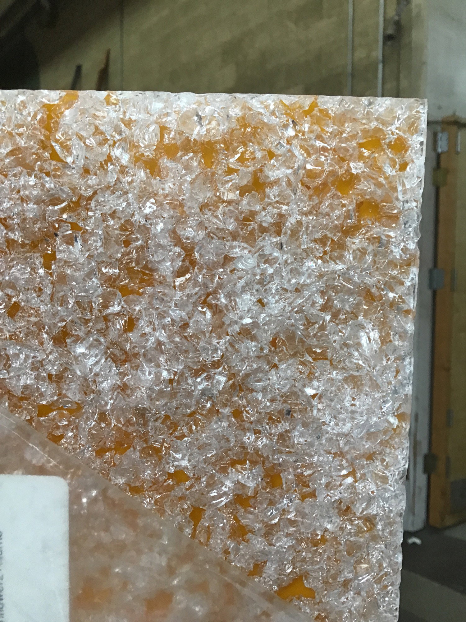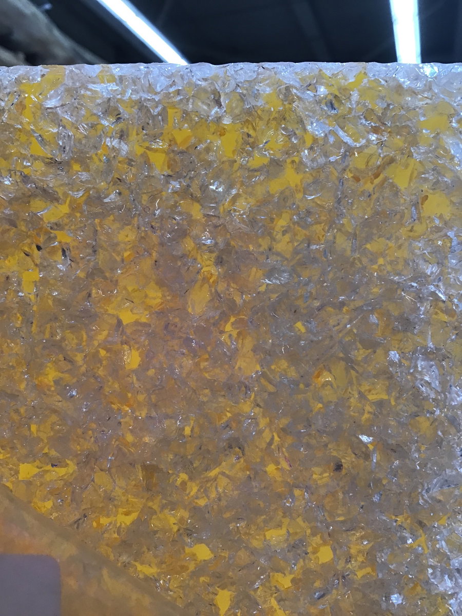 This high end 3/8” thick 48"x96" acrylic sheet in a "Crystal #1 Recycled Glass" shimmery glassy yellow pattern. It looks like it's filled with broken safety glass and it's gorgeous! It still has the plastic film on it. It’s a remnant from a commercial project, produced by Lumicor. This sheet retails for over $2100, but you can get it for a fraction of the cost.