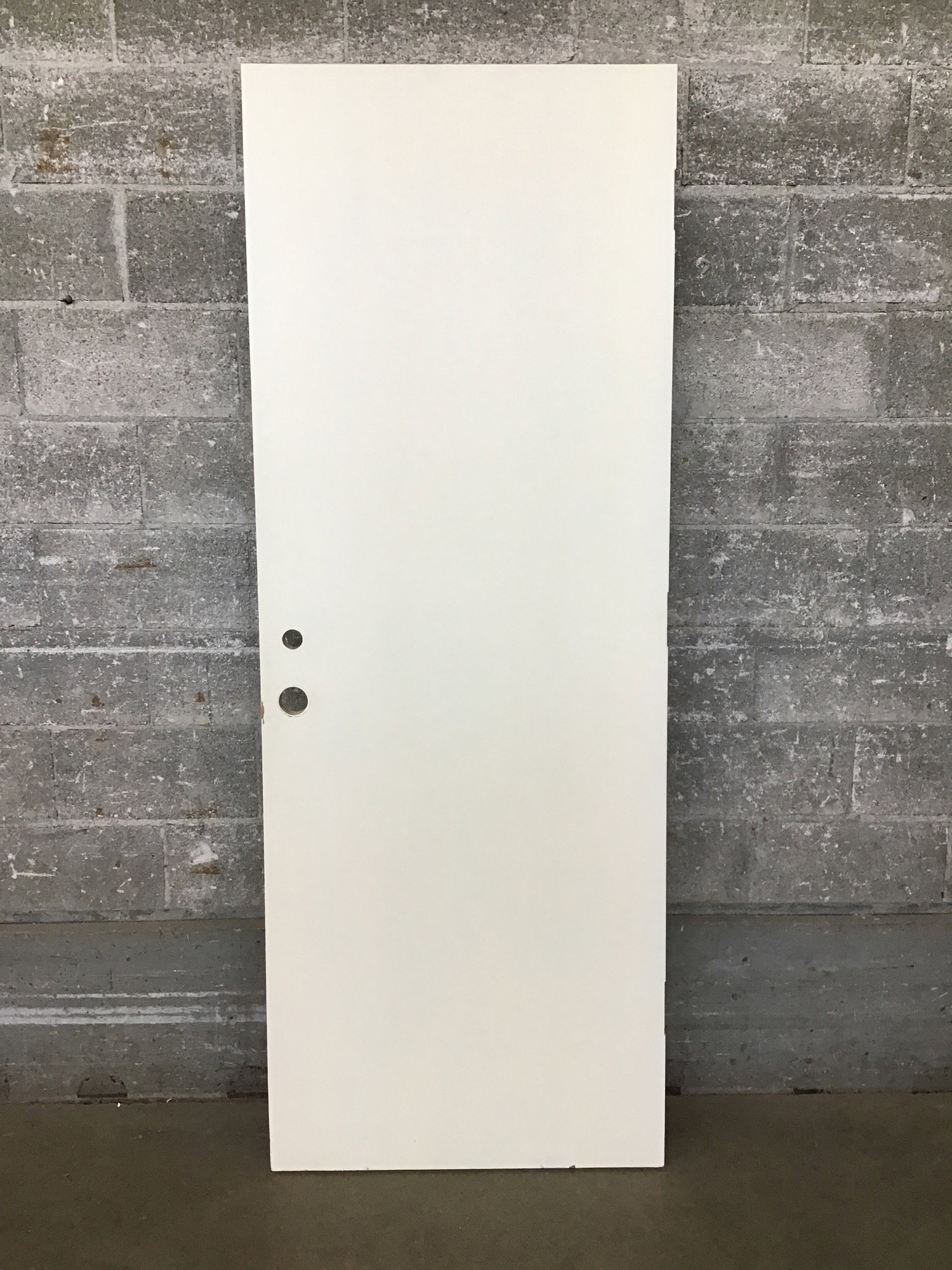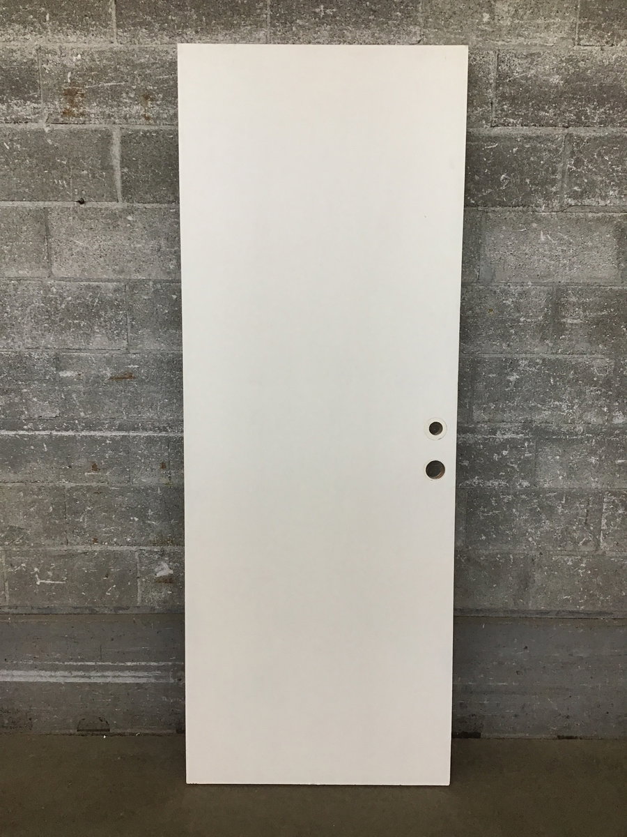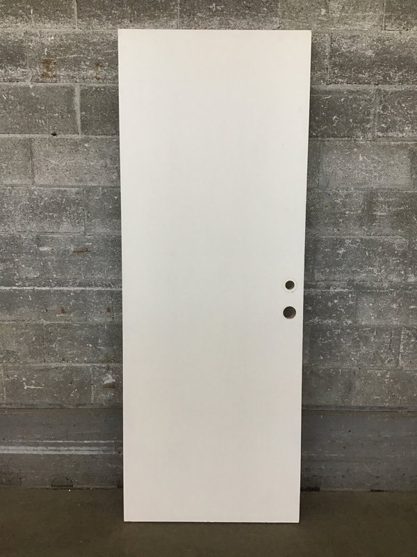 Flush face, white painted solid core door that is exterior thickness and bored for a small deadbolt. This would be a good door for a garage to home or another place where you want a little extra insulation but it won't be exposed to the elements.