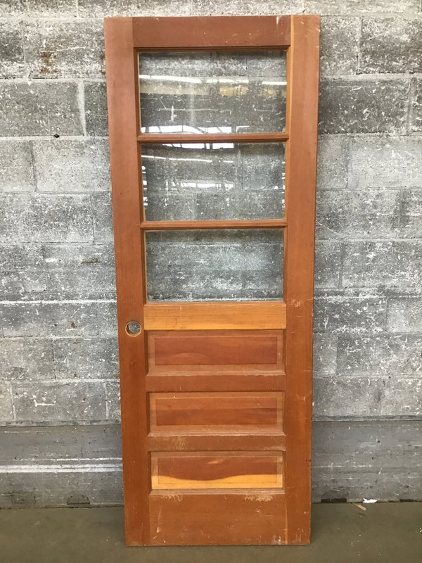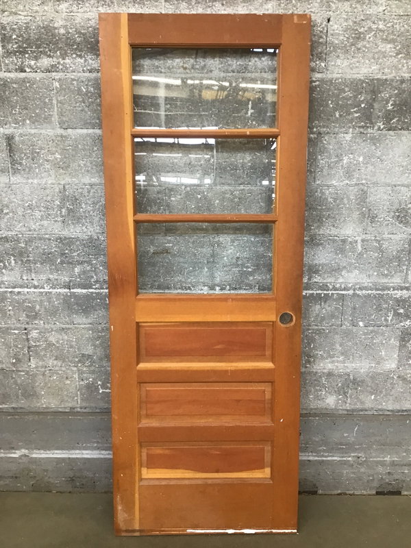 Cute three raised panels under three single pane lites, half lite door. Exterior thickness. Has a few dings, but a solid CVG fir construction (no veneer) so you can sand to your hearts content to get it to sparkle if you want. Still a nice looking door as it sits.