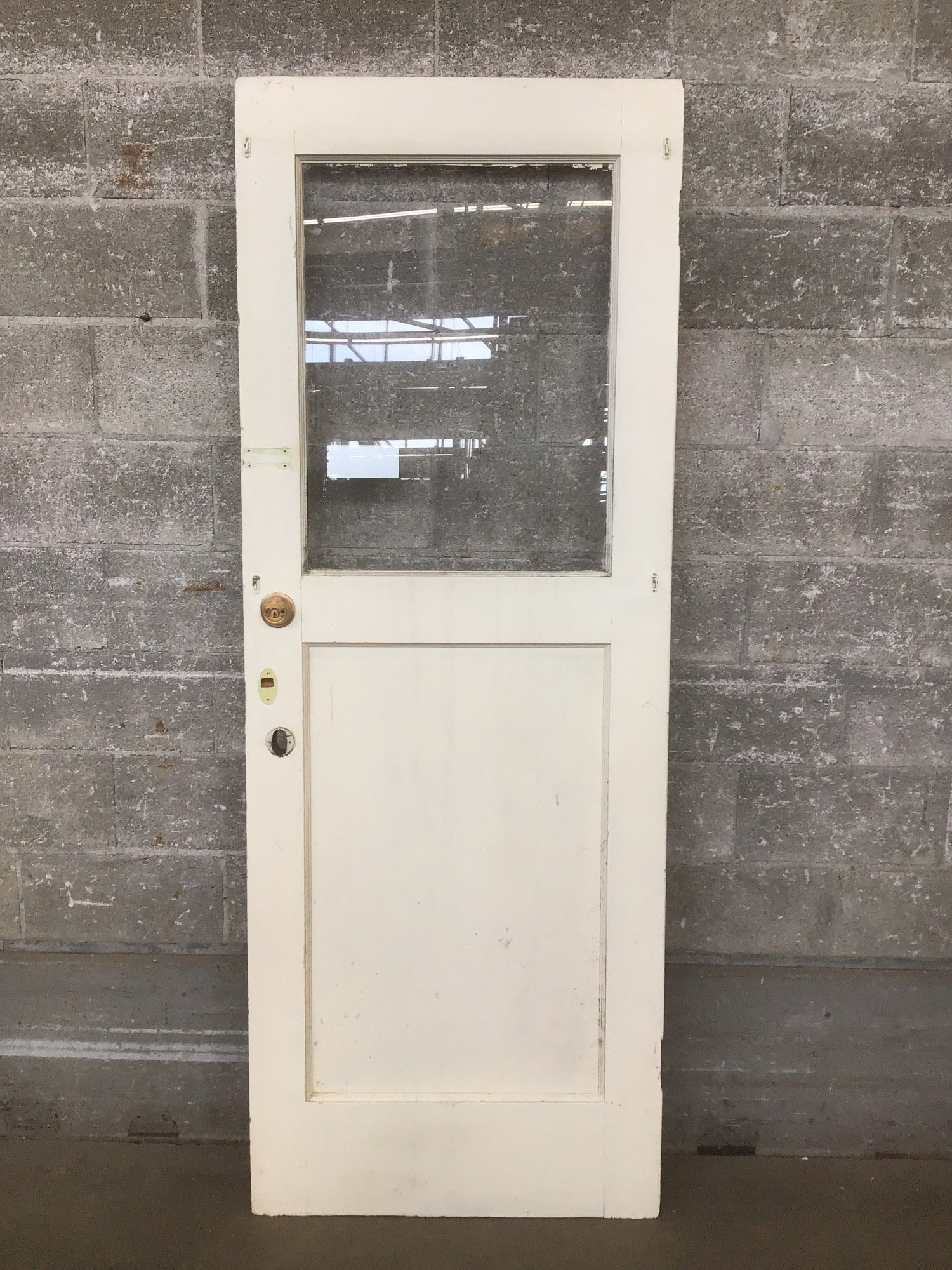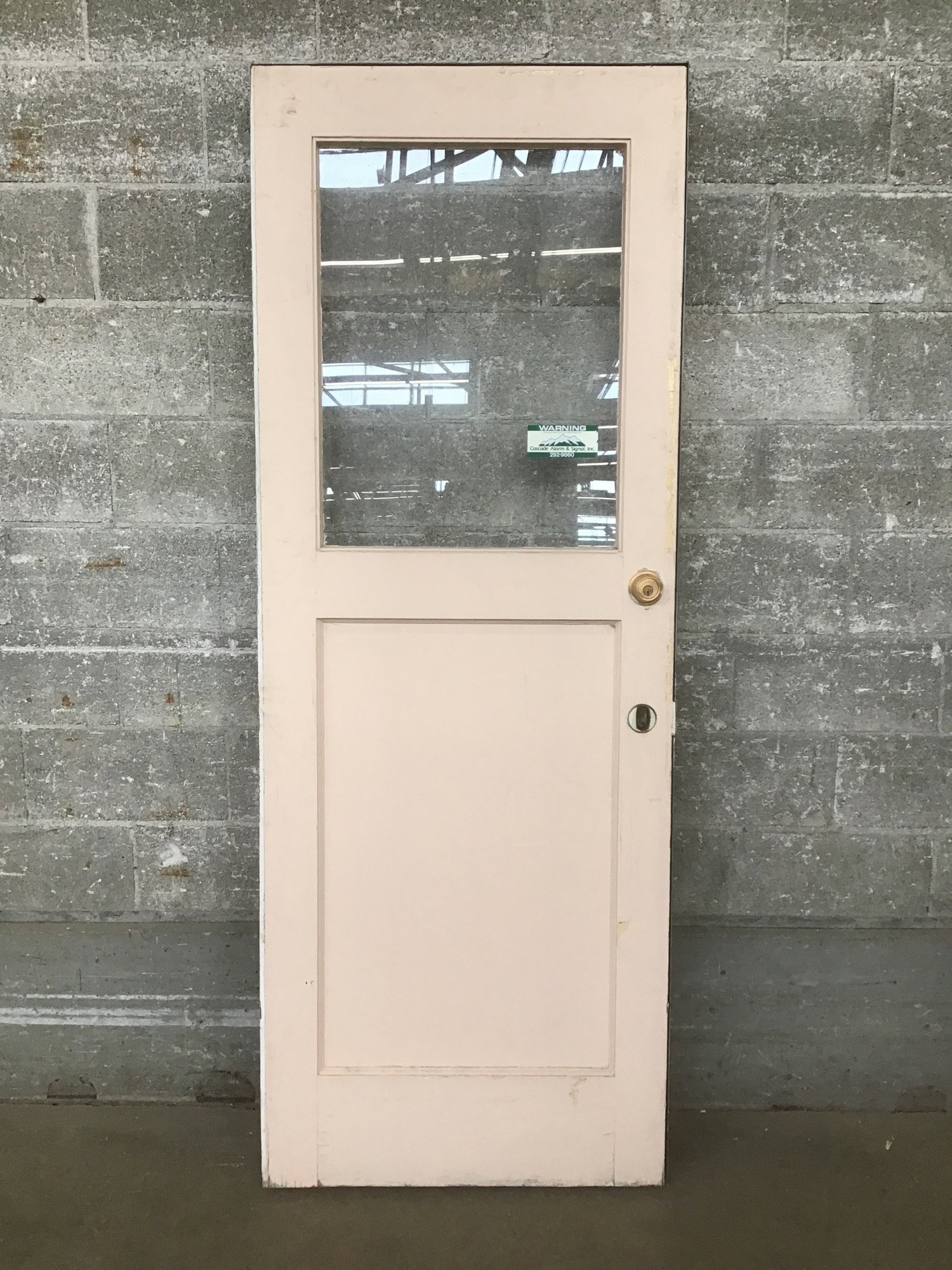 Vintage exterior half lite door that is probably destined for a shed or the like. It has j-hook weather stripping and the deadbolt will need to be cut or pried off, as there is one decimated screw holding it in place.