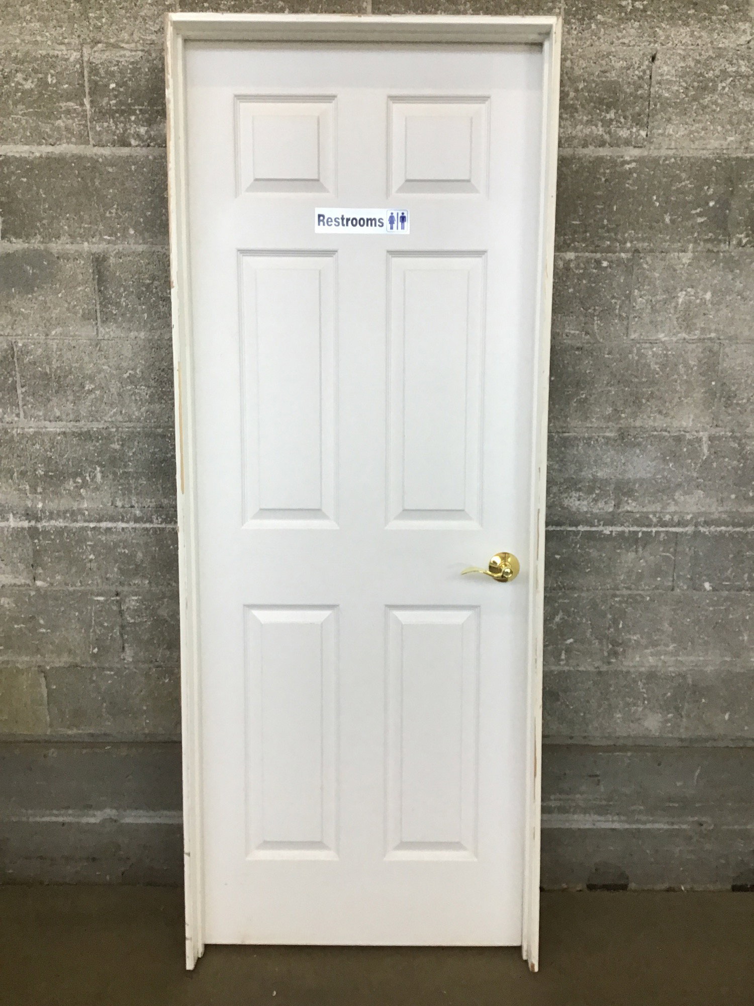30" Hollow Core Panelled Door LH swing with 6 faux panels with a faux oak skin, painted white. Has brass hardware and a restroom sign.