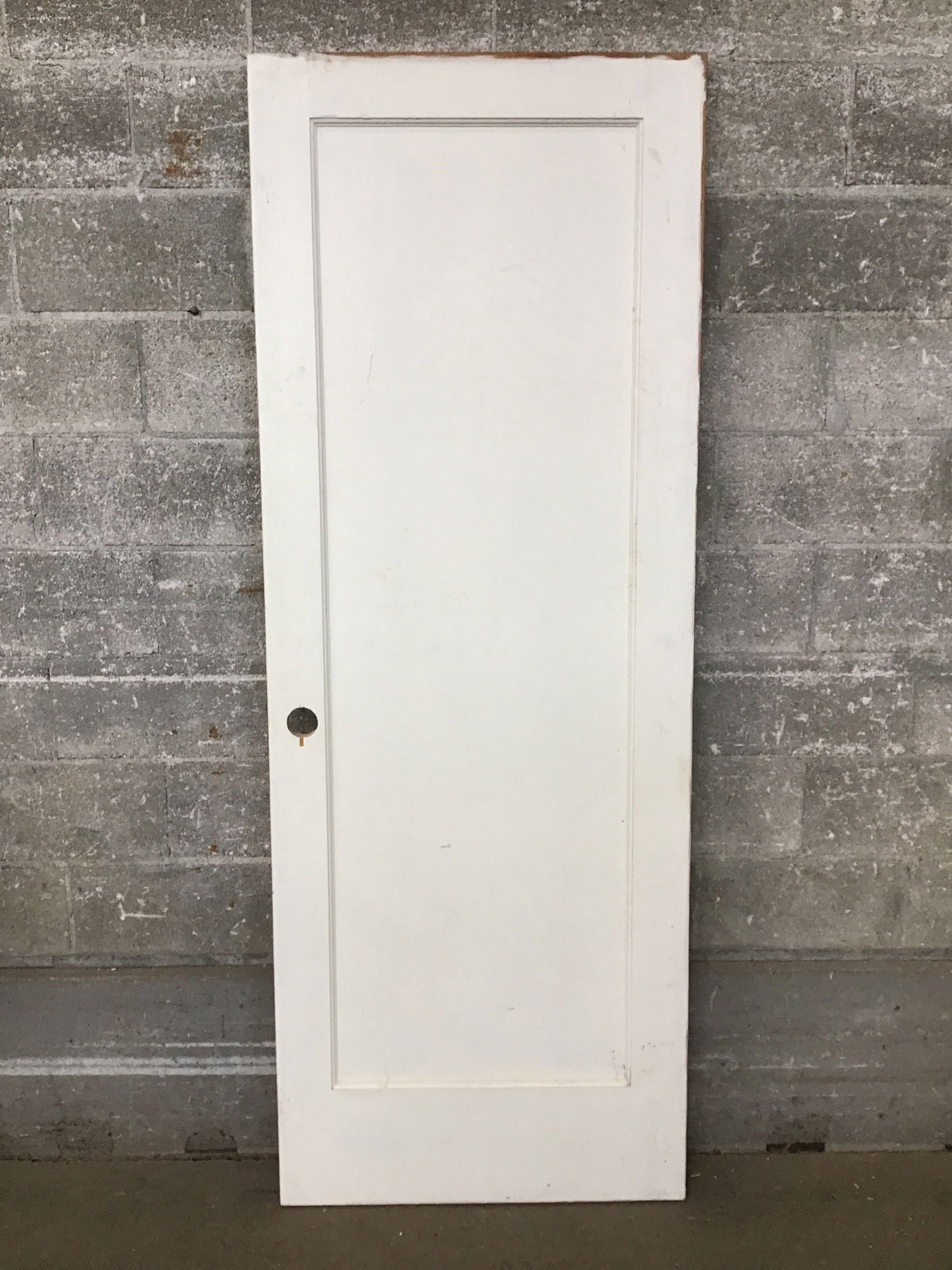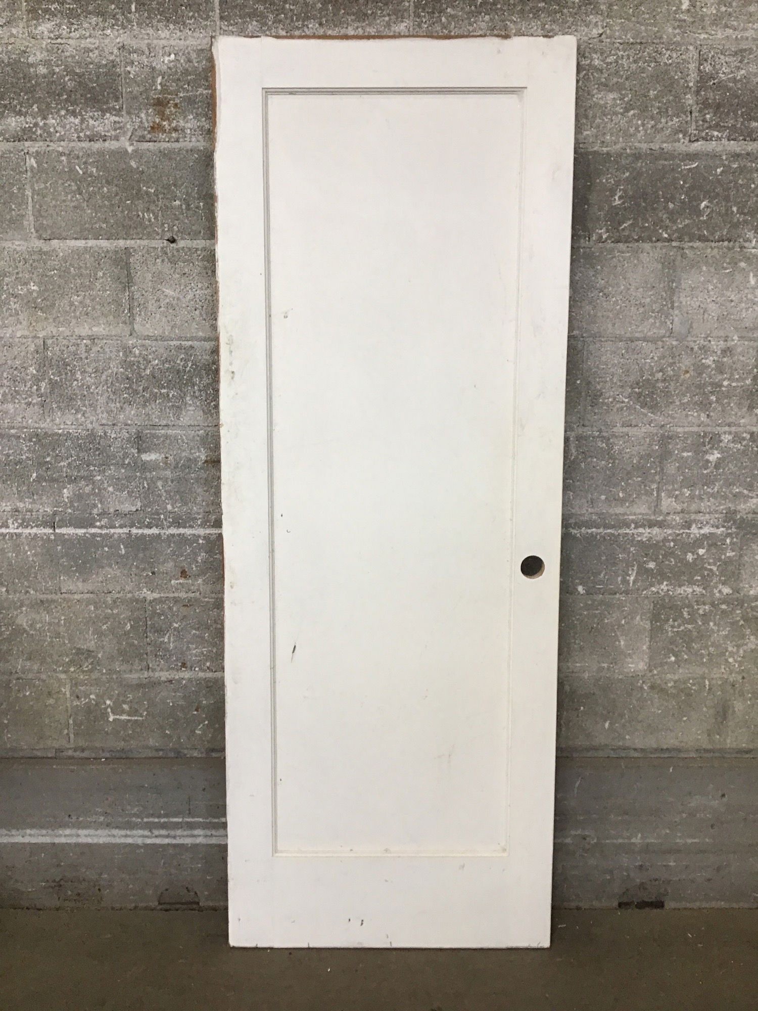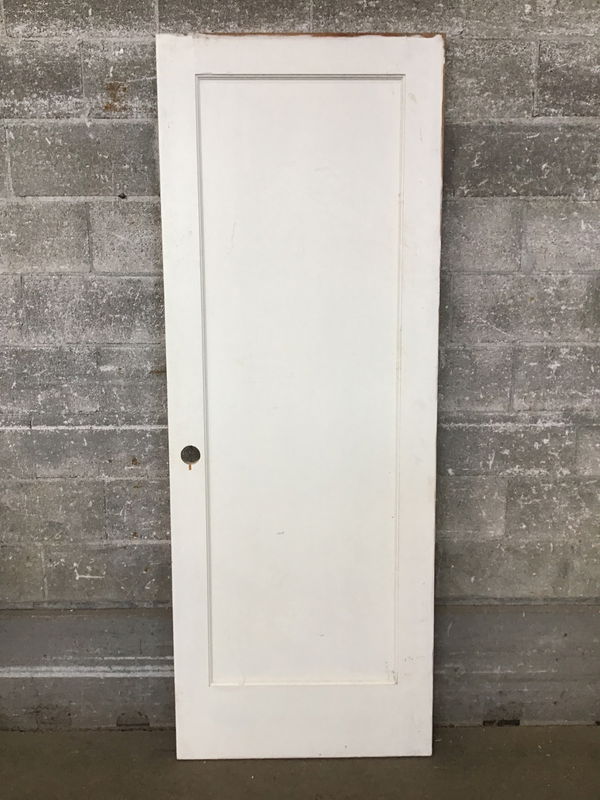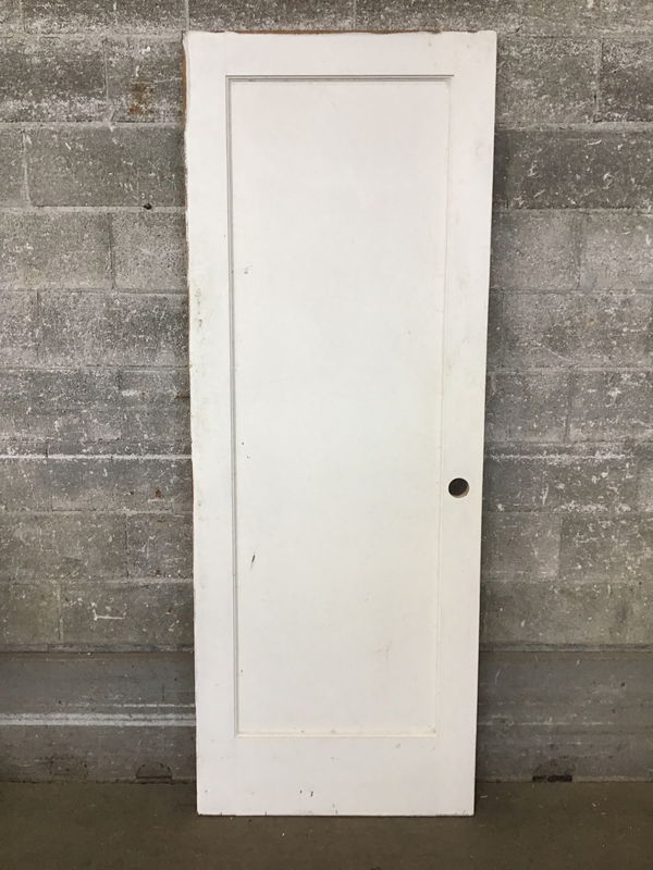 Recessed single panel interior door painted white. Could use a fresh coat.
