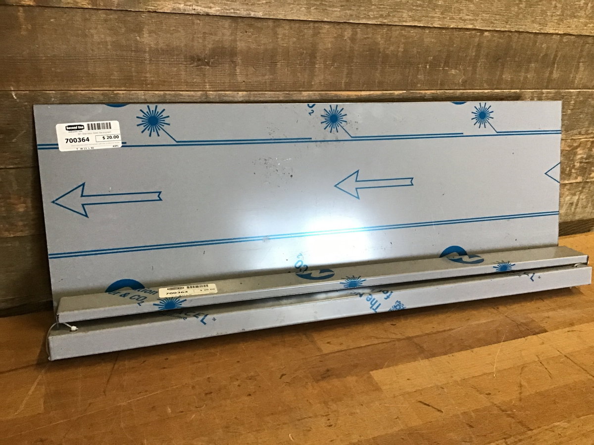 Short stainless steel backsplash with the protective sticker layer still on it. Great for adding a protective backdrop to your small kitchen range setup!