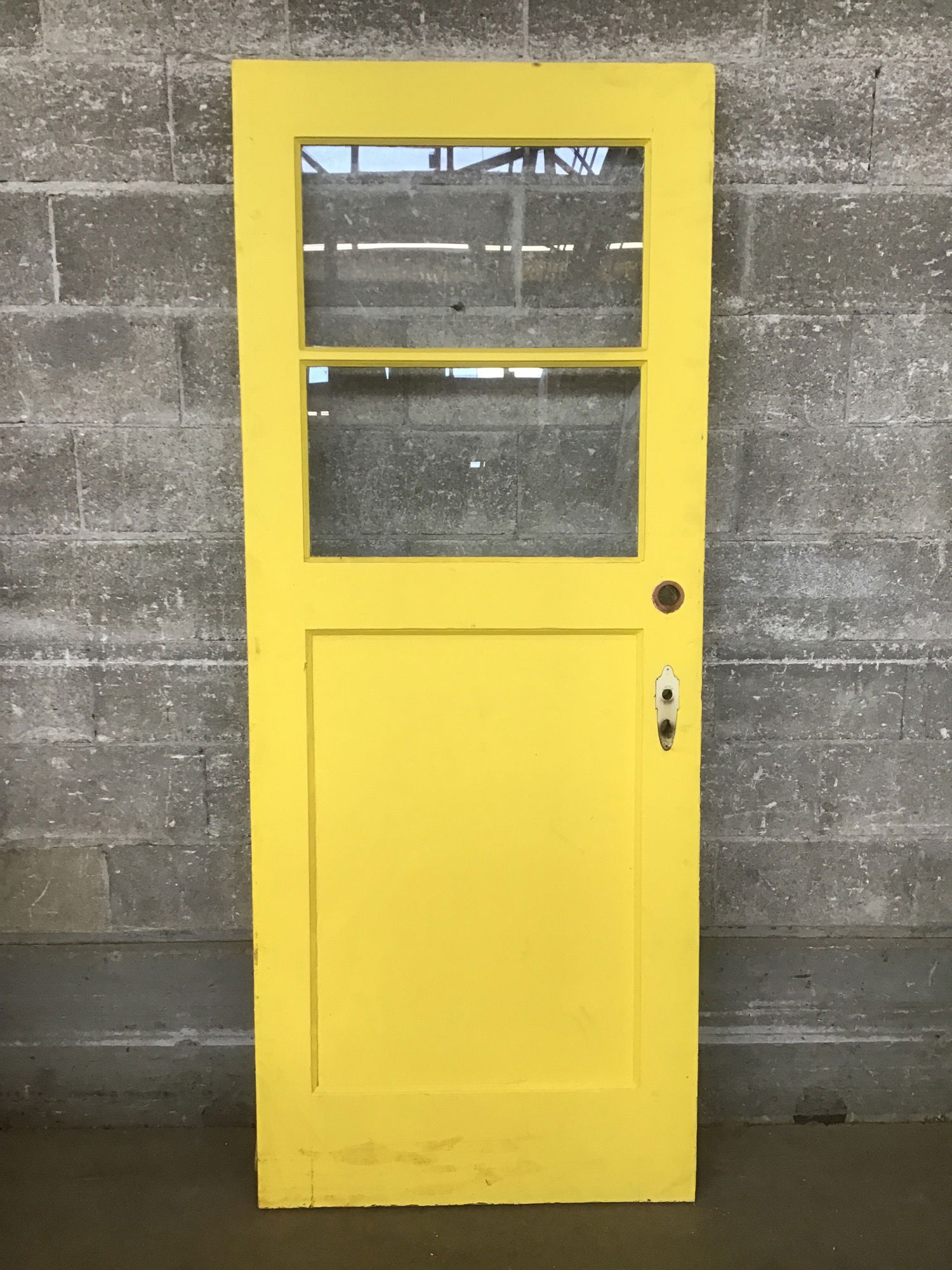 This exterior vintage door features two half lite panes of true divided glass and a single beveled panel on each lower side. One side painted white, the other yellow. This would make a good back or front door for a vintage home.