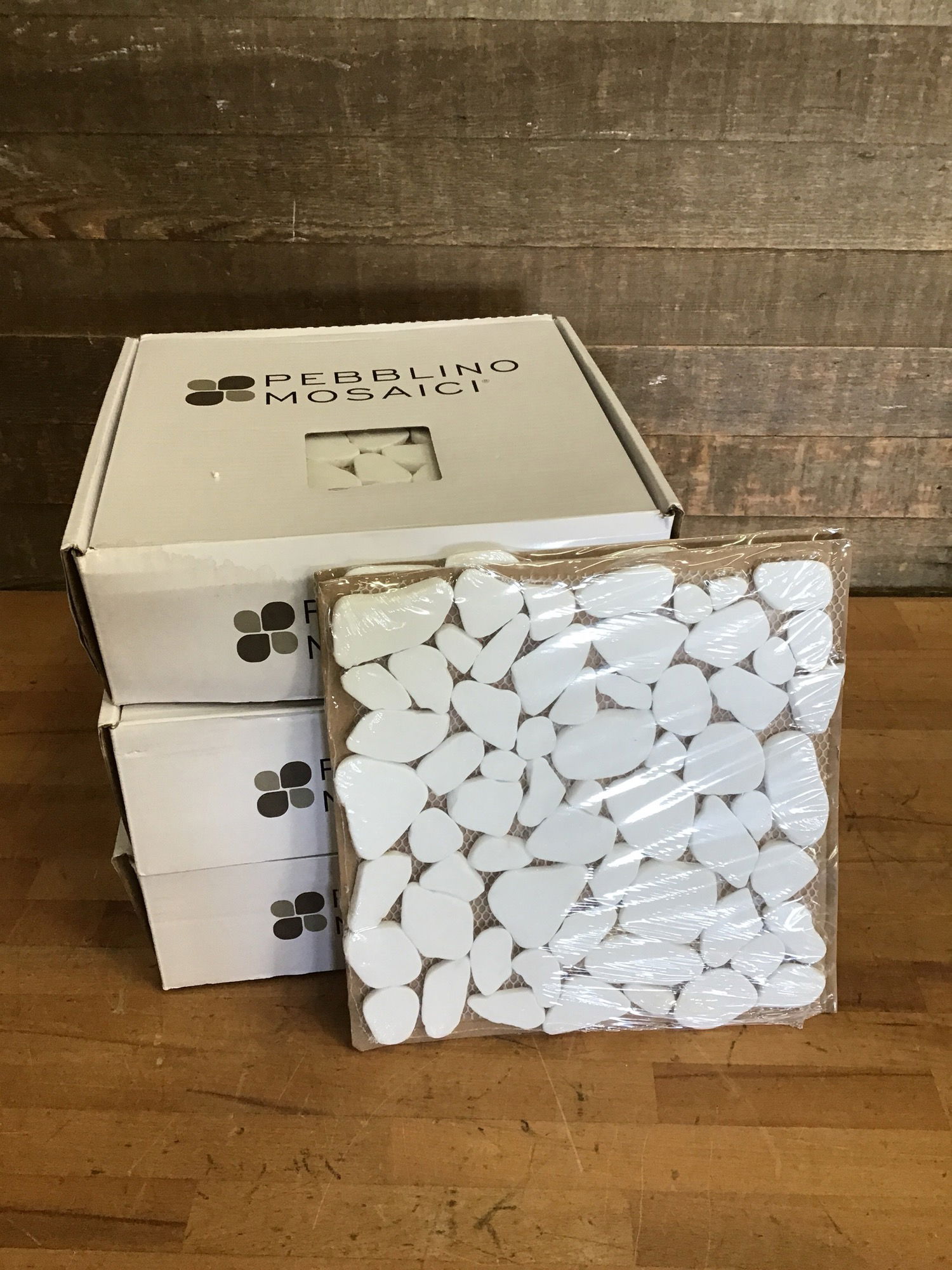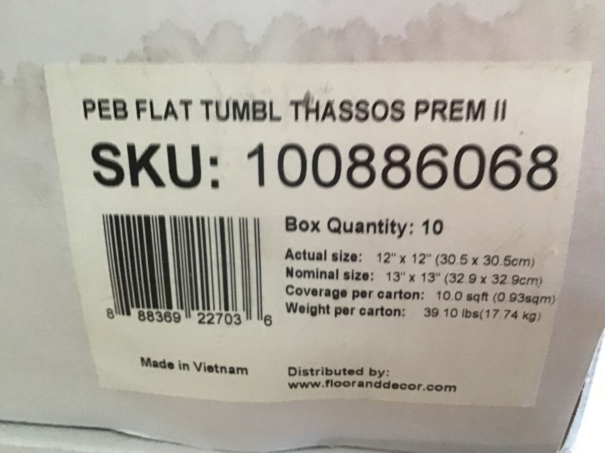 32 sheets of new Pebblino Mosaici tile. This is the "Flat Tumbled Thassos Premium II Pebble Marble Mosaic" and sells new for almost $17 a sheet! See here for details. There are three full boxes, plus two sheets, leaving you with 32 square footage of material. Perfect for smaller projects like a back splash or accent wall inside a shower!