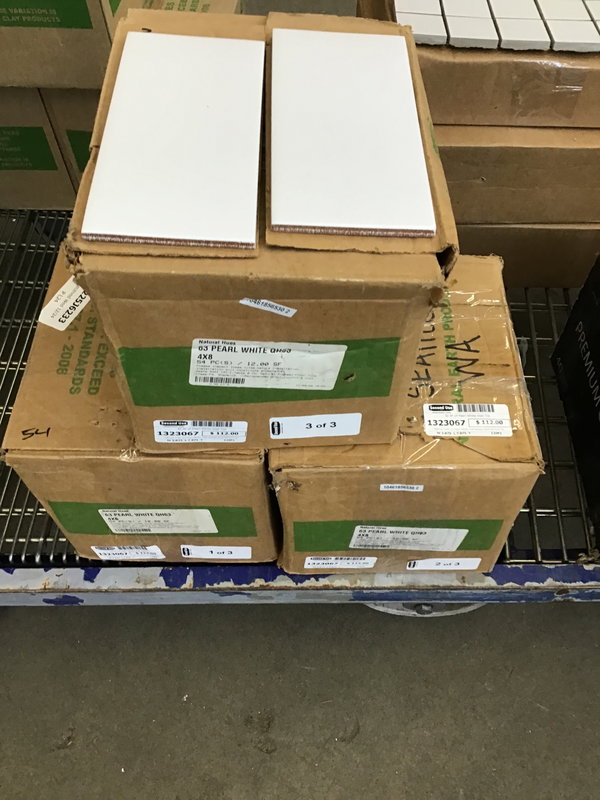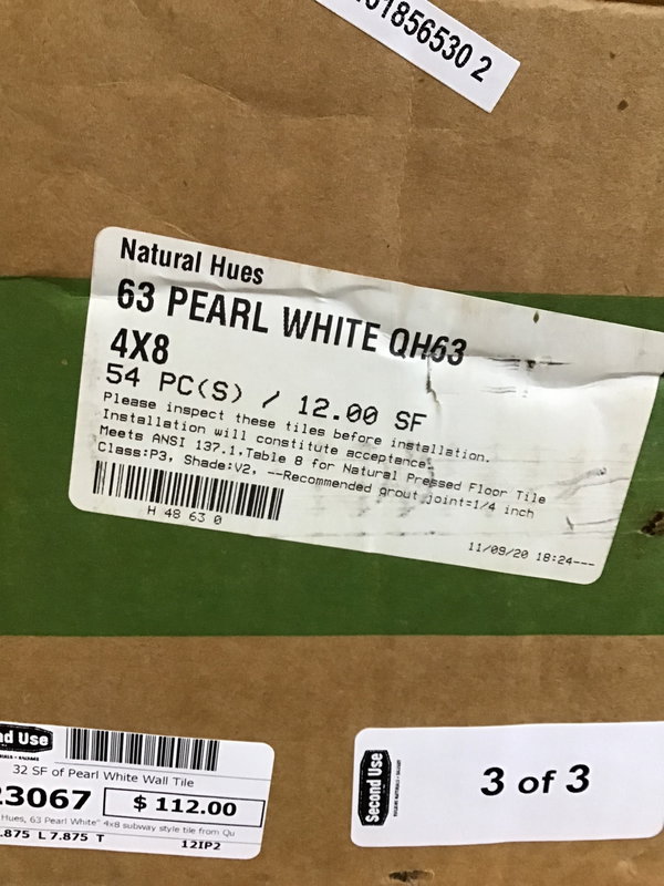 "Natural Hues, 63 Pearl White" 4x8 subway style tile from Quarry Tile, there are two full boxes of 54 pieces (12 square feet of coverage per box), and one with 39 good pieces in it and some that were cracked and might be usable in an offset design. Lot is priced based on square footage. Looks to retail for $16.04 per SF.