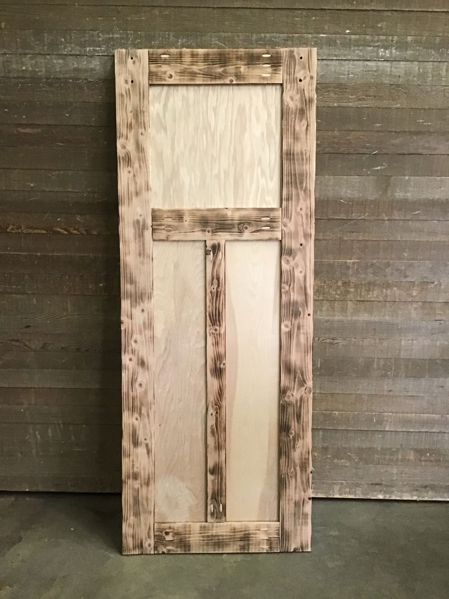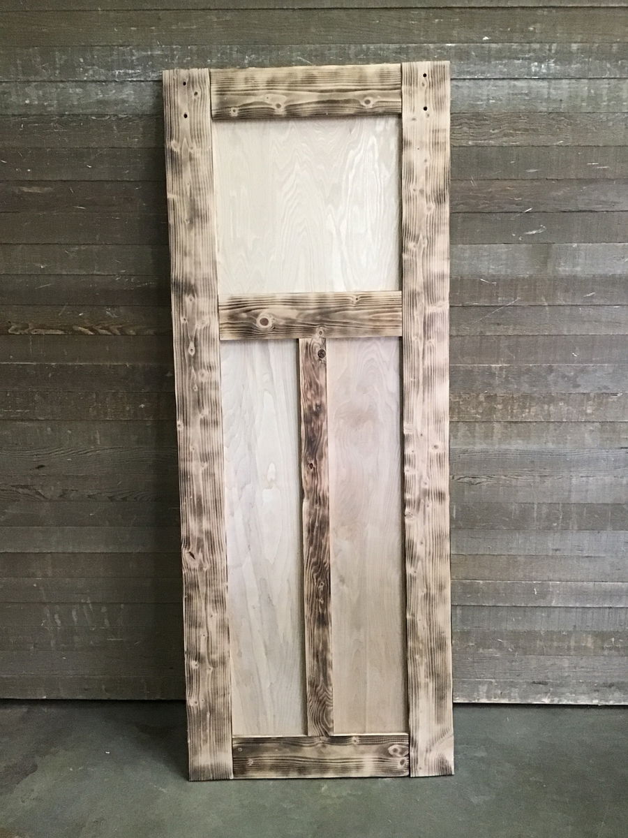 3 panel door set up as a barn sliding door with holes bored at the top for the hardware.