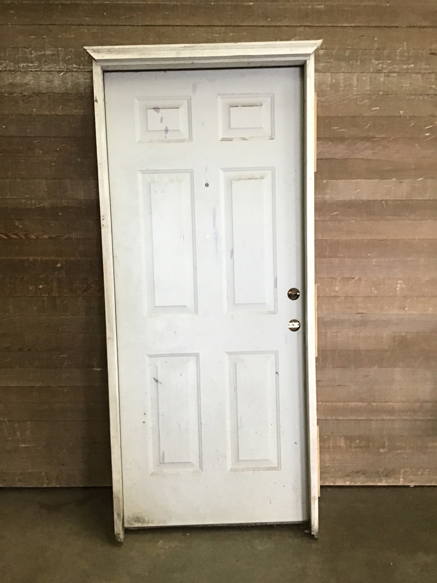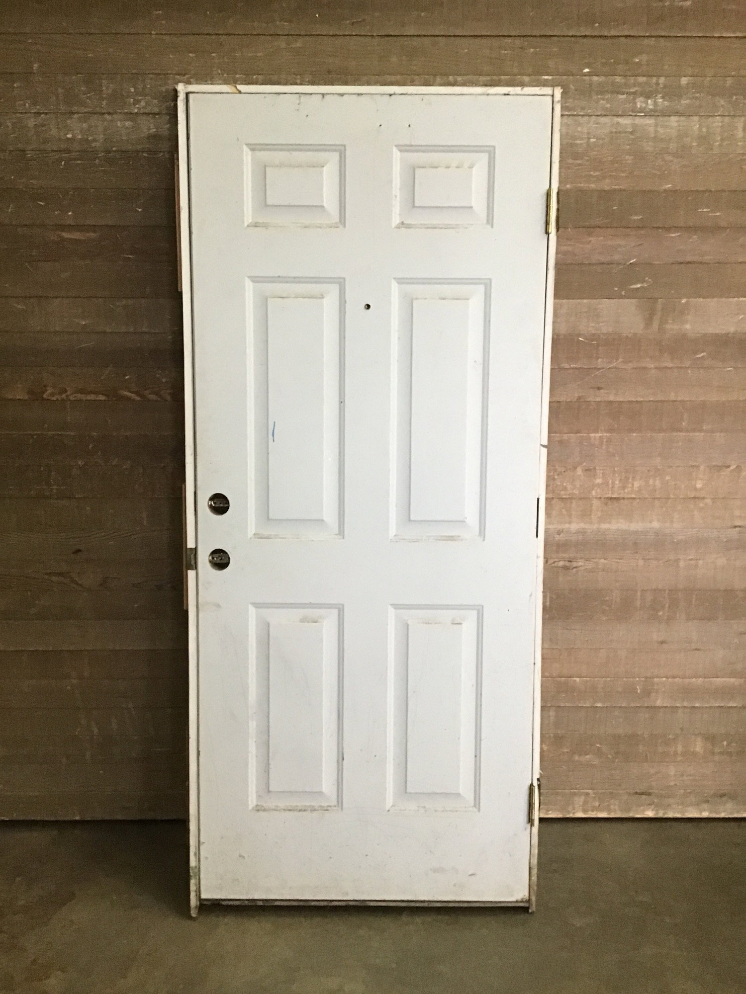 Steel clad 34" pre-hung exterior door in good used shape. A little beat up and looks like it might be sitting on the wrong sized hinges but still solid and could make a great shed door.