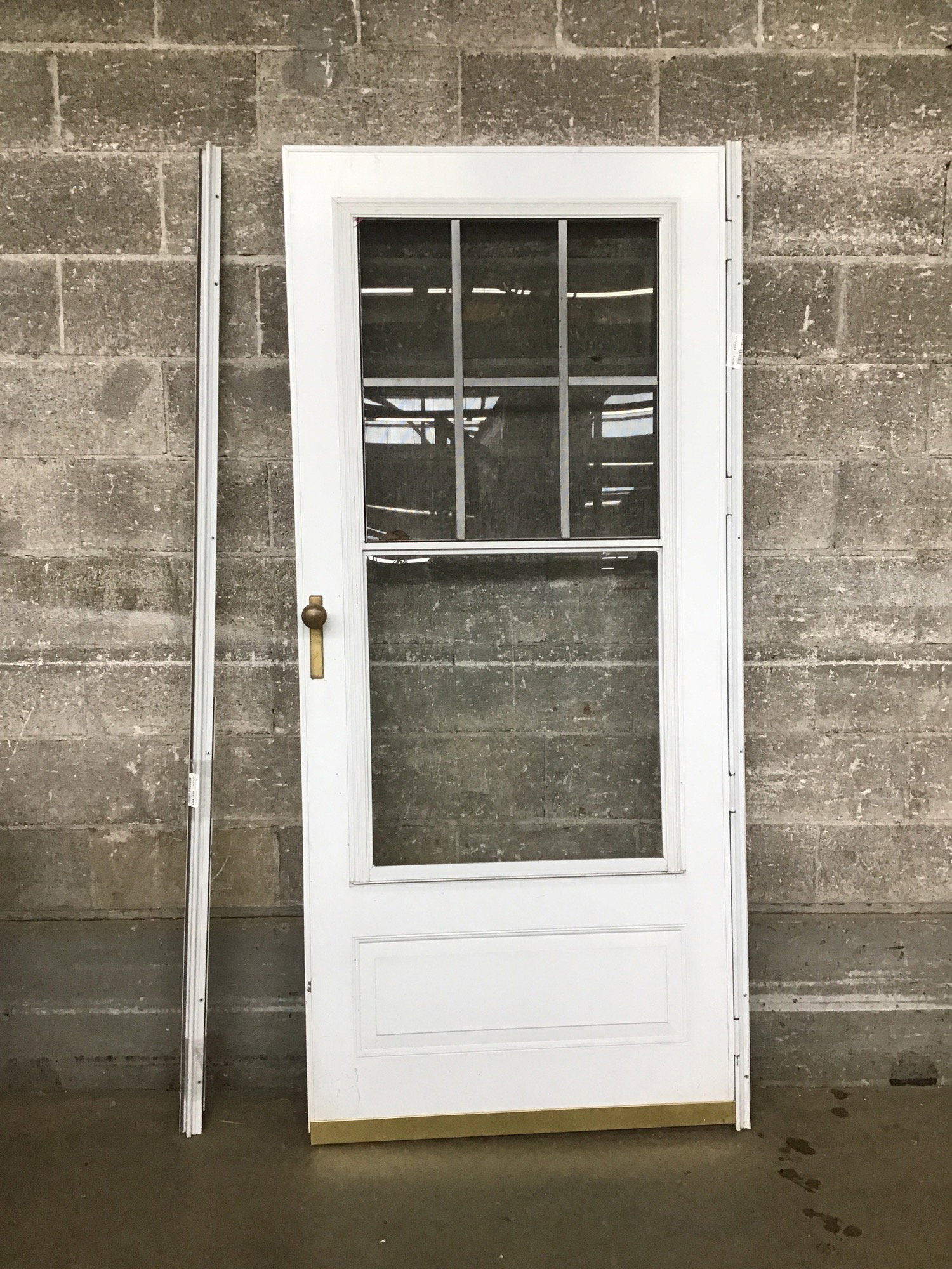 An aluminum storm door that looks to be in good shape, complete with its trim pieces. It has a single-hung window on it that's got false mullions and a screen and is made using tempered glass.