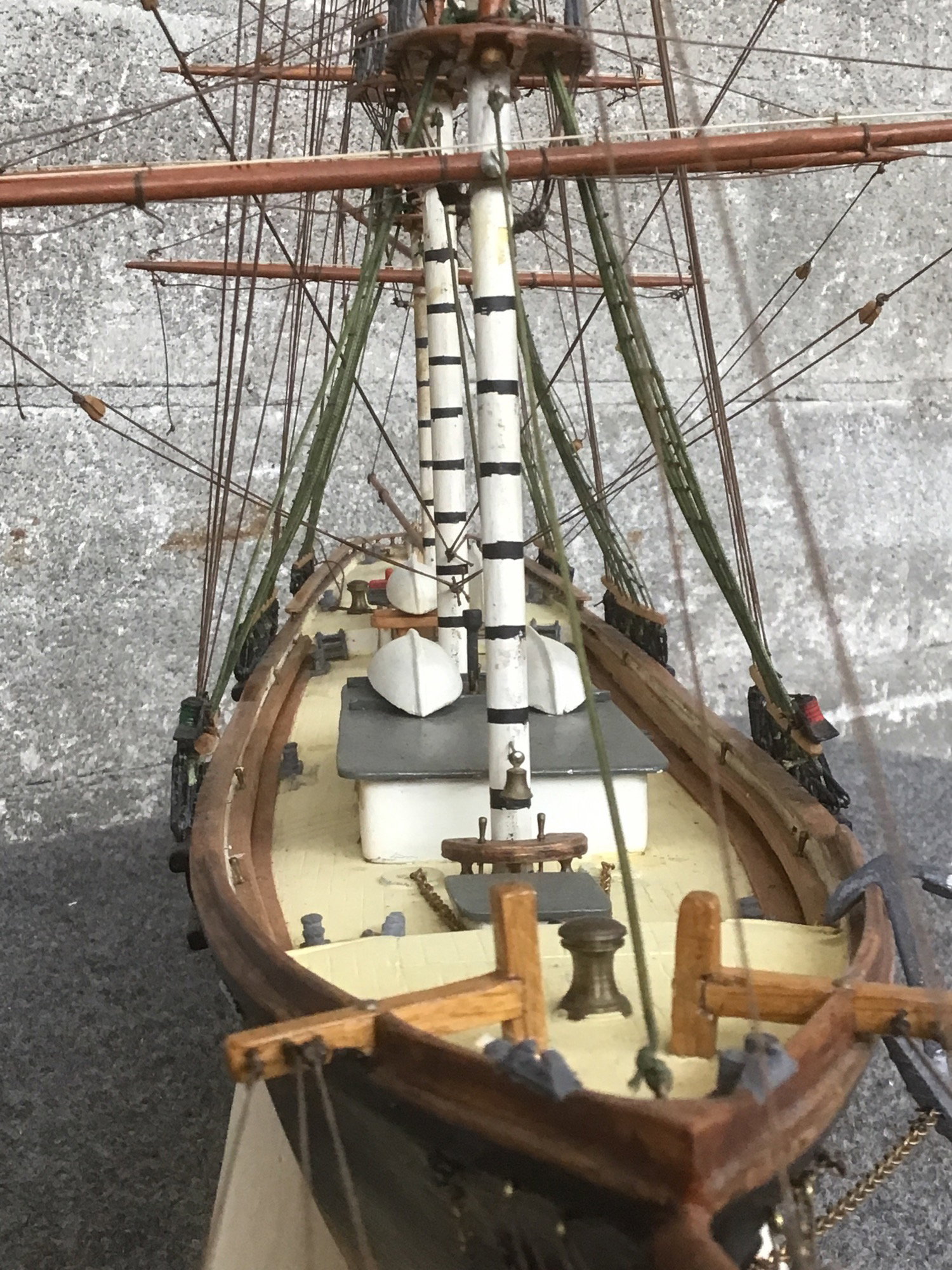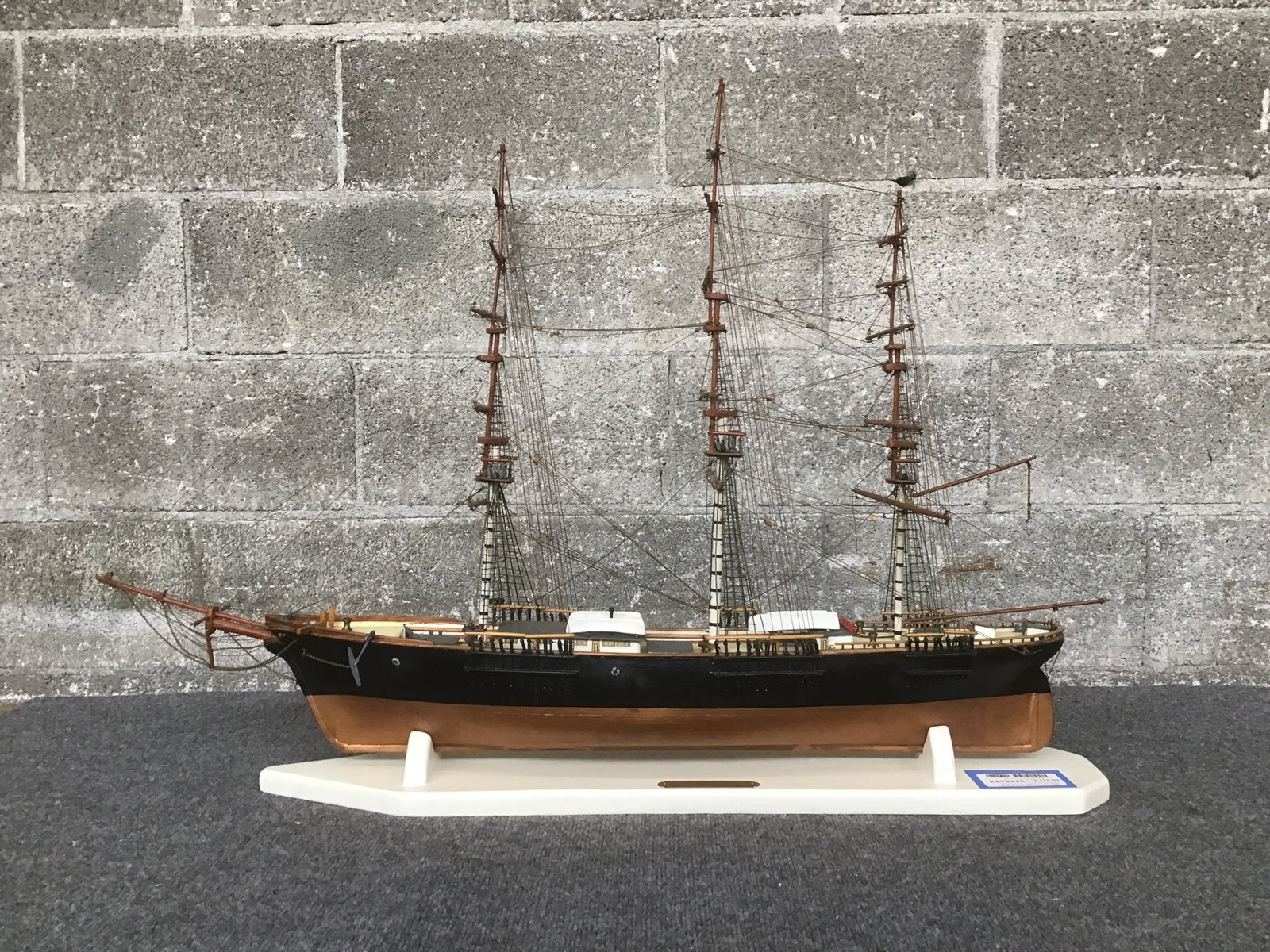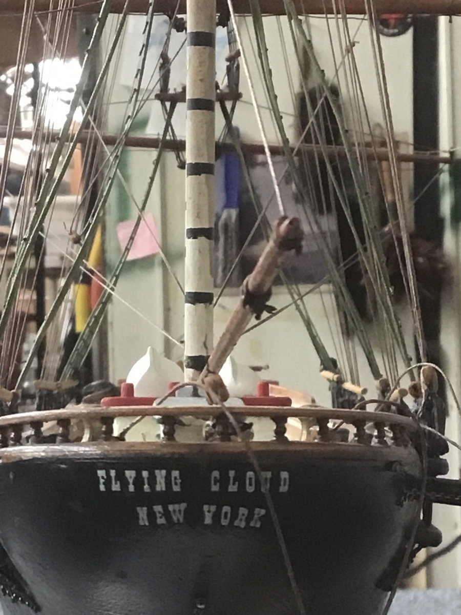 Pretty sweet 35" boat model chock full of details like life boats, stairs, and anchors on board! Labeled "Flying Cloud" on the stand it rests on. Seems to be complete and in great shape given its delicate nature. This baby would make a great centerpiece in an aficionado's quarters!