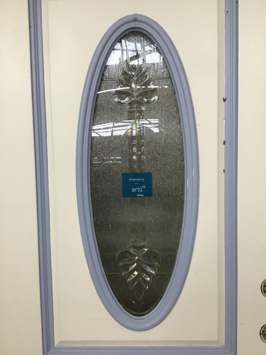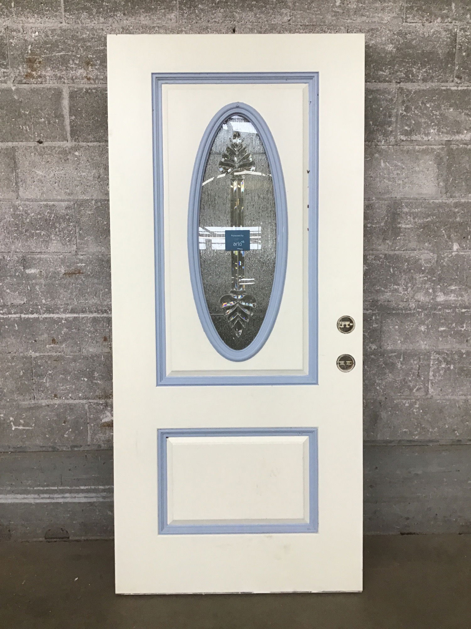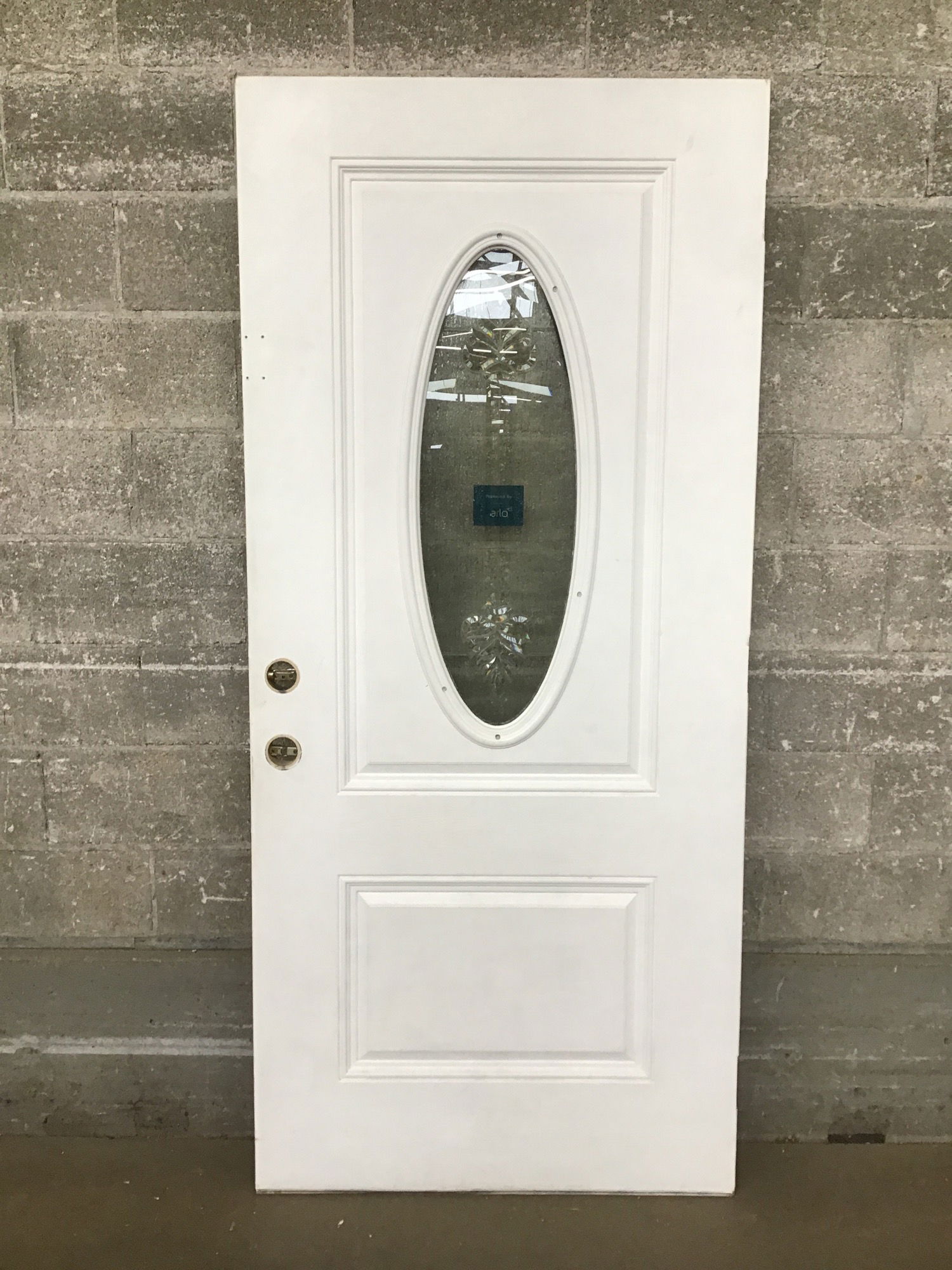 36" Exterior Half Lite Door with a fiberglass skin that has a faux wood grain pattern. There is an oval shaped lite in the middle with ornate textures and beveled panes.