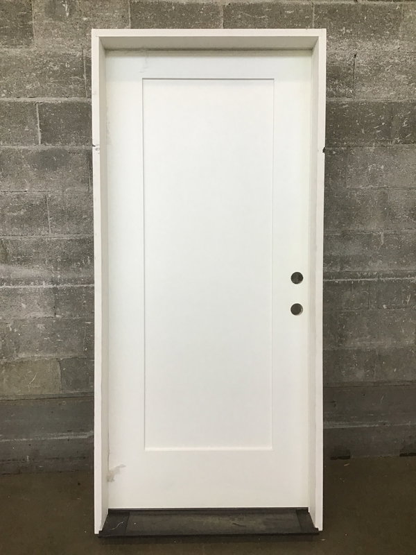 A single-panel exterior-facing door with one panel and a skin of fiberglass cladding, plus holes bored for lock and knobsets. This baby is fully ready to go, just plug it in for your shed, garage, back door, or wherever you're in need of a good, sturdy door!