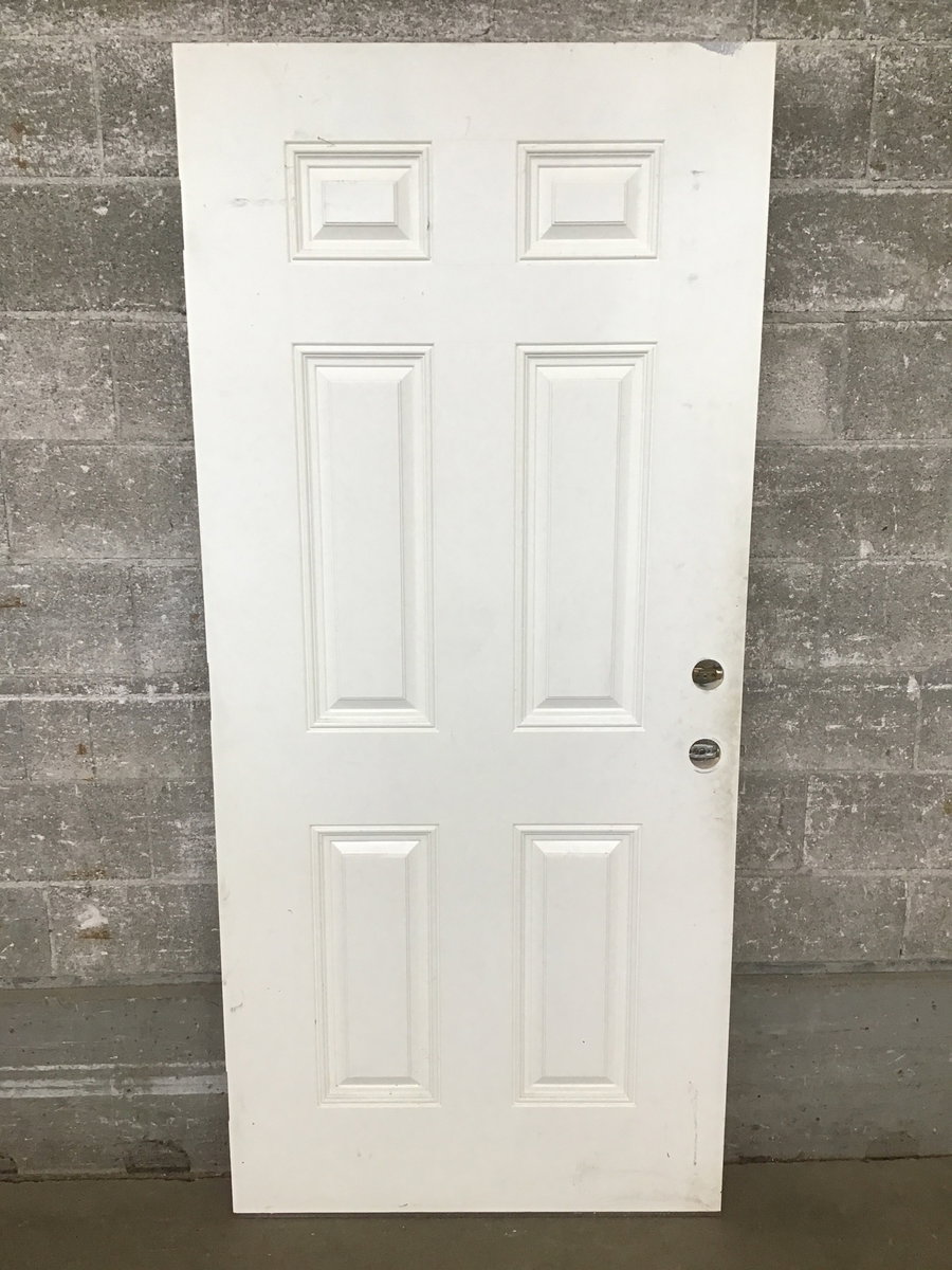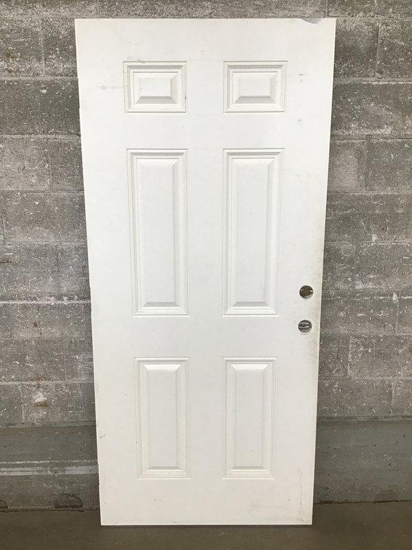 36" Fiberglass Entry Door with 6 raised panels. Drilled for knob and deadbolt. Has a bit of damage towards the top on one side.