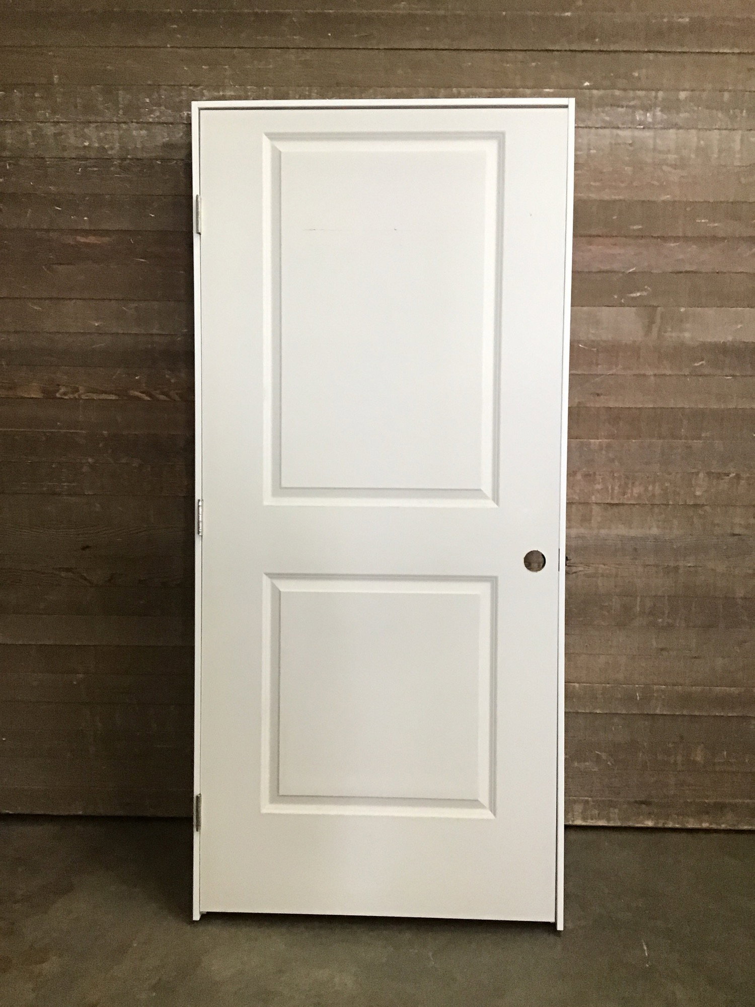 New, never installed 36" hollow core faux two raised panel door prehung in an MDF jamb. This door is primed and ready to paint the color of your choice. Right hand swing hinge cuts and a bore hole. There may be some minor cosmetic damage. Photo may be representative.
