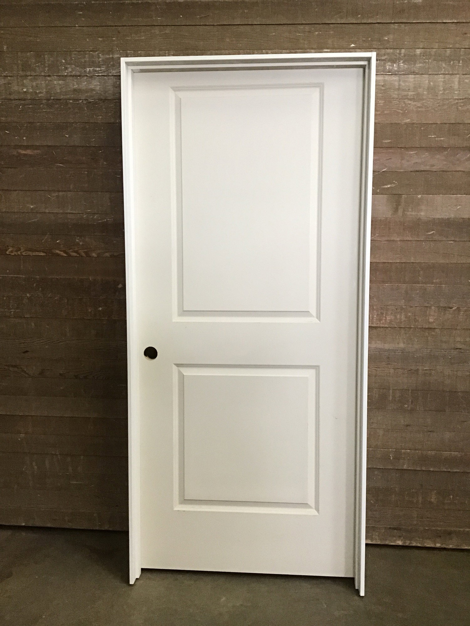 New, never installed 36" hollow core faux two raised panel door prehung in an MDF jamb. This door is primed and ready to paint the color of your choice. Right hand swing hinge cuts and a bore hole. There may be some minor cosmetic damage. Photo may be representative.
