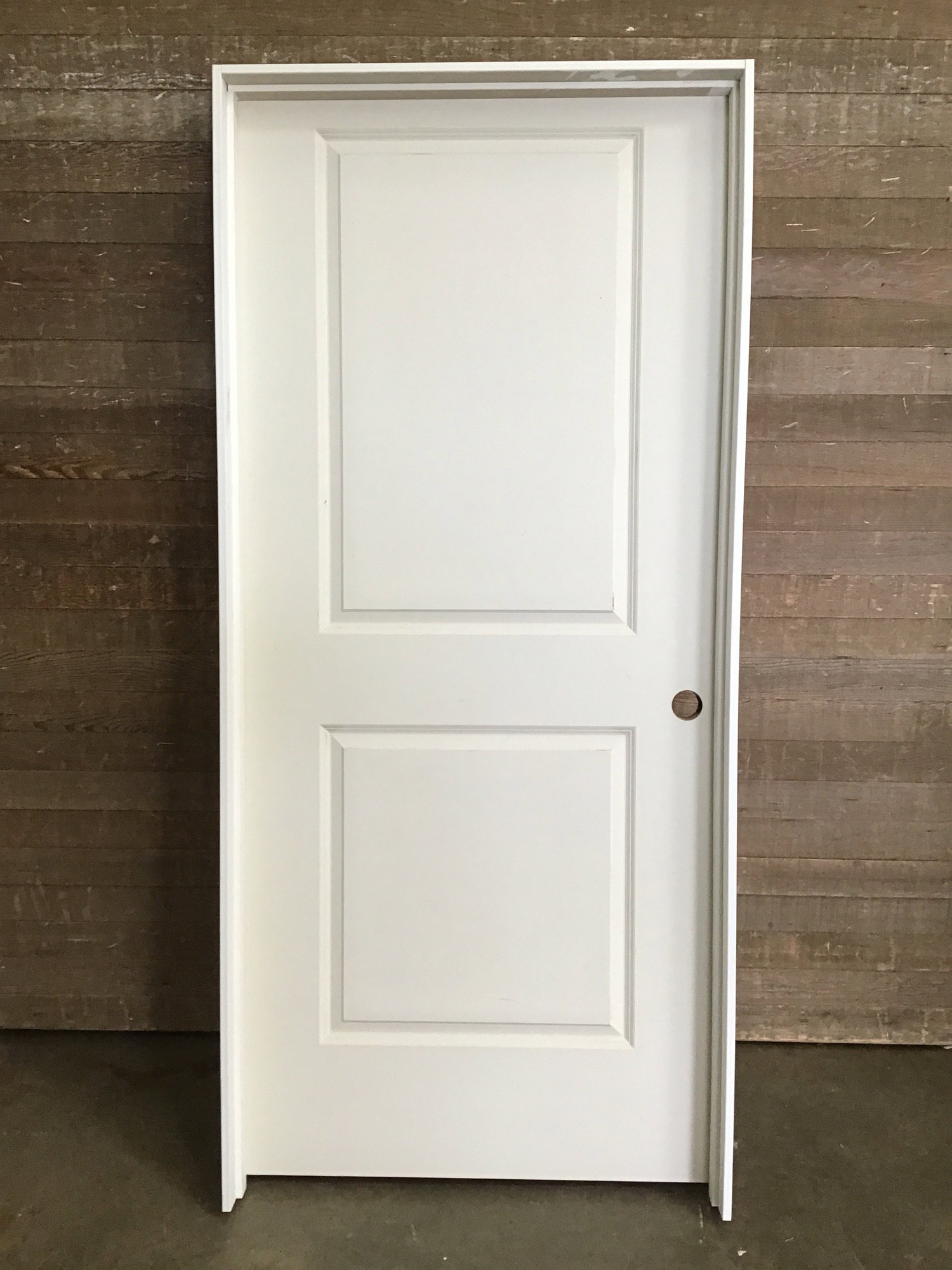 New, never installed 36" hollow core faux two raised panel door prehung in an MDF jamb. This door is primed and ready to paint the color of your choice. Left hand swing hinge cuts and a bore hole. There may be some minor cosmetic damage. Photo may be representative.