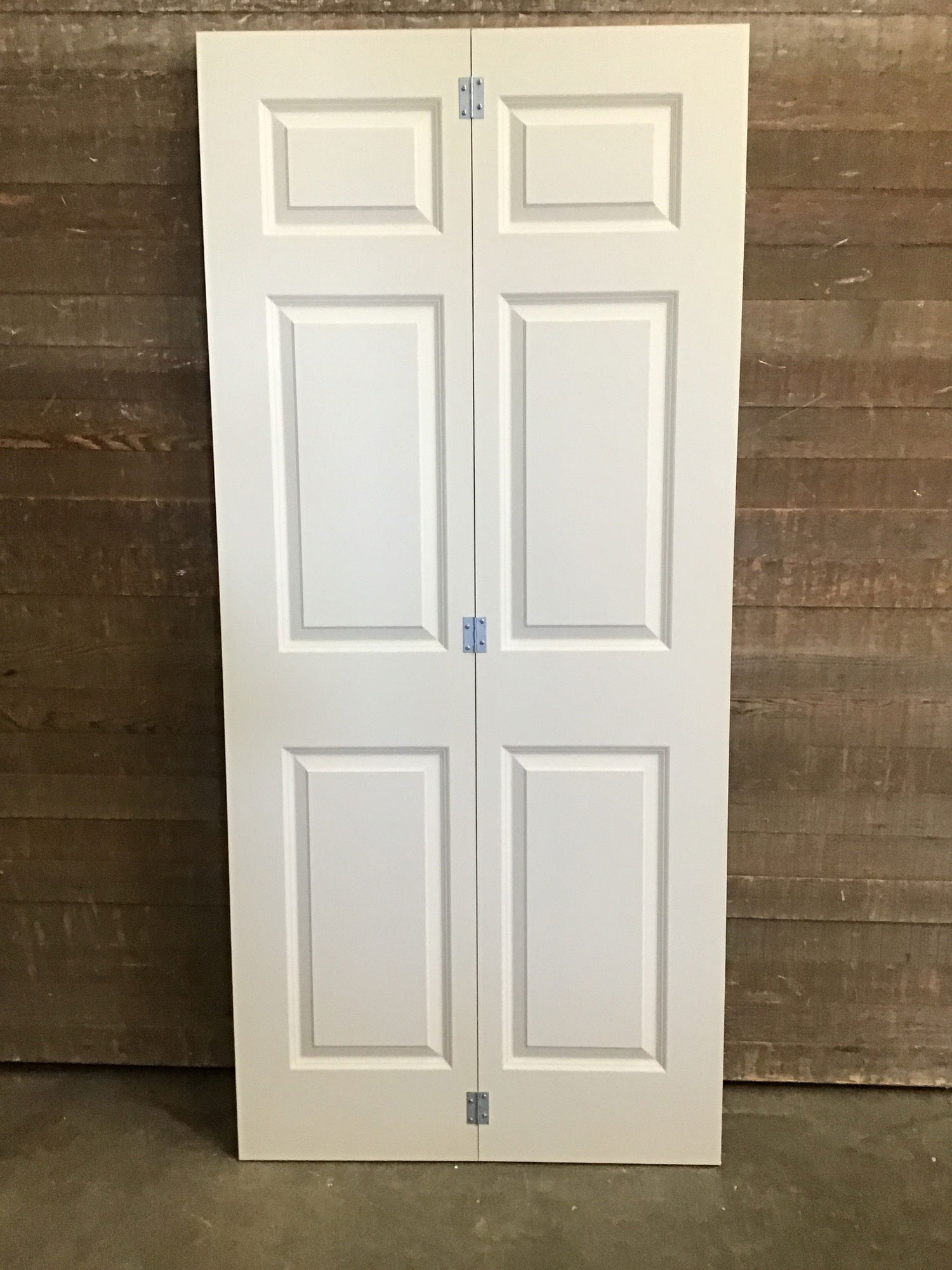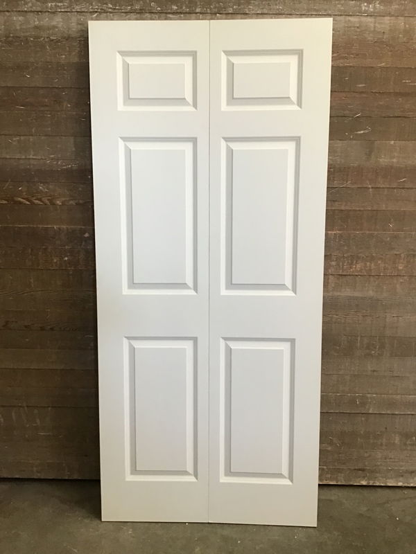 New, never installed 36" hollow core bi-fold door with six faux raised panels. This door is primed and ready to paint the color of your choice. There may be some minor cosmetic damage. Does not come with track or hardware.