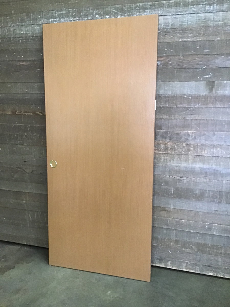 Previously installed, 36" hollow core interior door with oak veneer. Was a pocket door in its past life. In overall good condition!