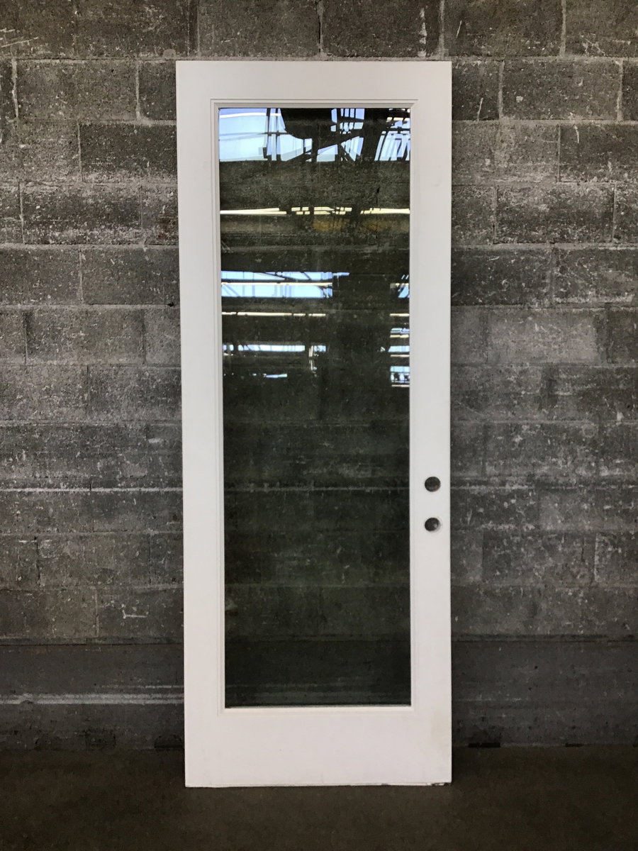 Extra tall, fiberglass (smooth) exterior door with one big, thermopane, tempered glass lite at its center. Appears to be in great shape with minimal cosmetic wear.