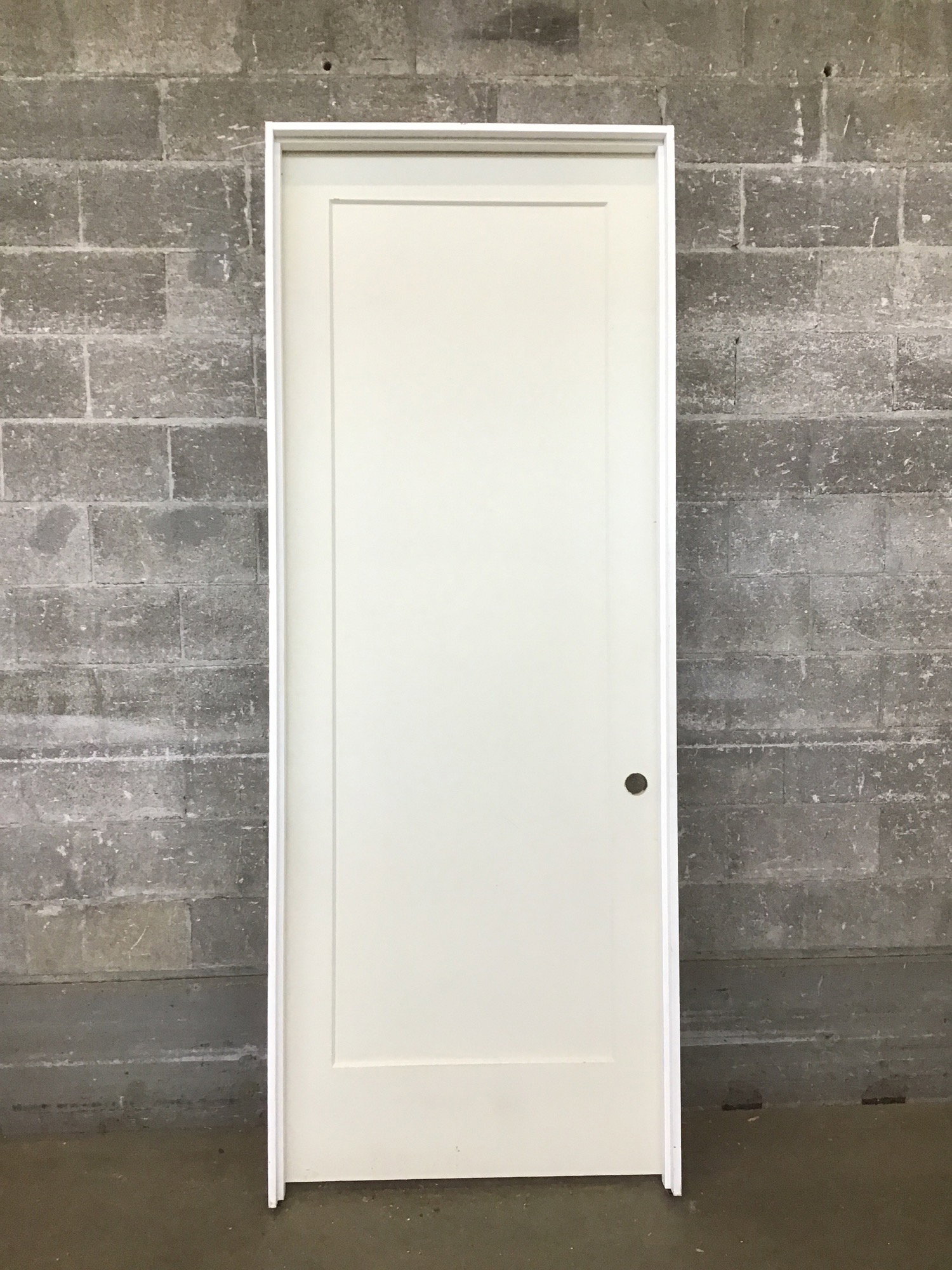A never before installed overheight hollow core "panel" door, hung in its jamb with a hole bored for a knobset.