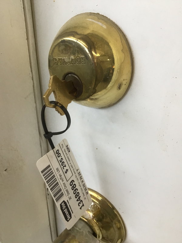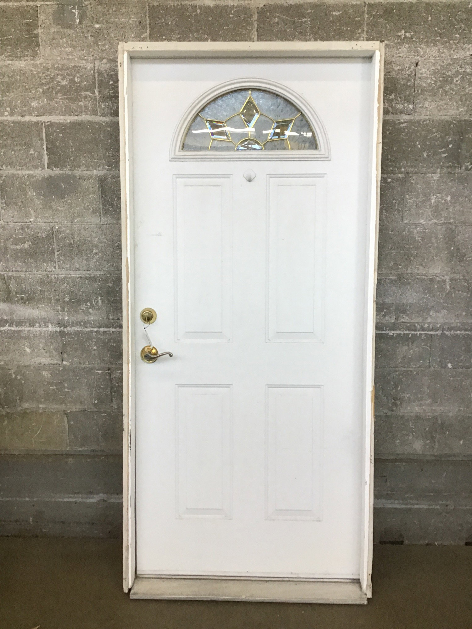 36" Steel Door w/Fan Lite RH swing with 4 raised panels. The fan lite is brass divided and has plenty of ornate details. Has deadbolt and knob that also comes with a key for the deadbolt!