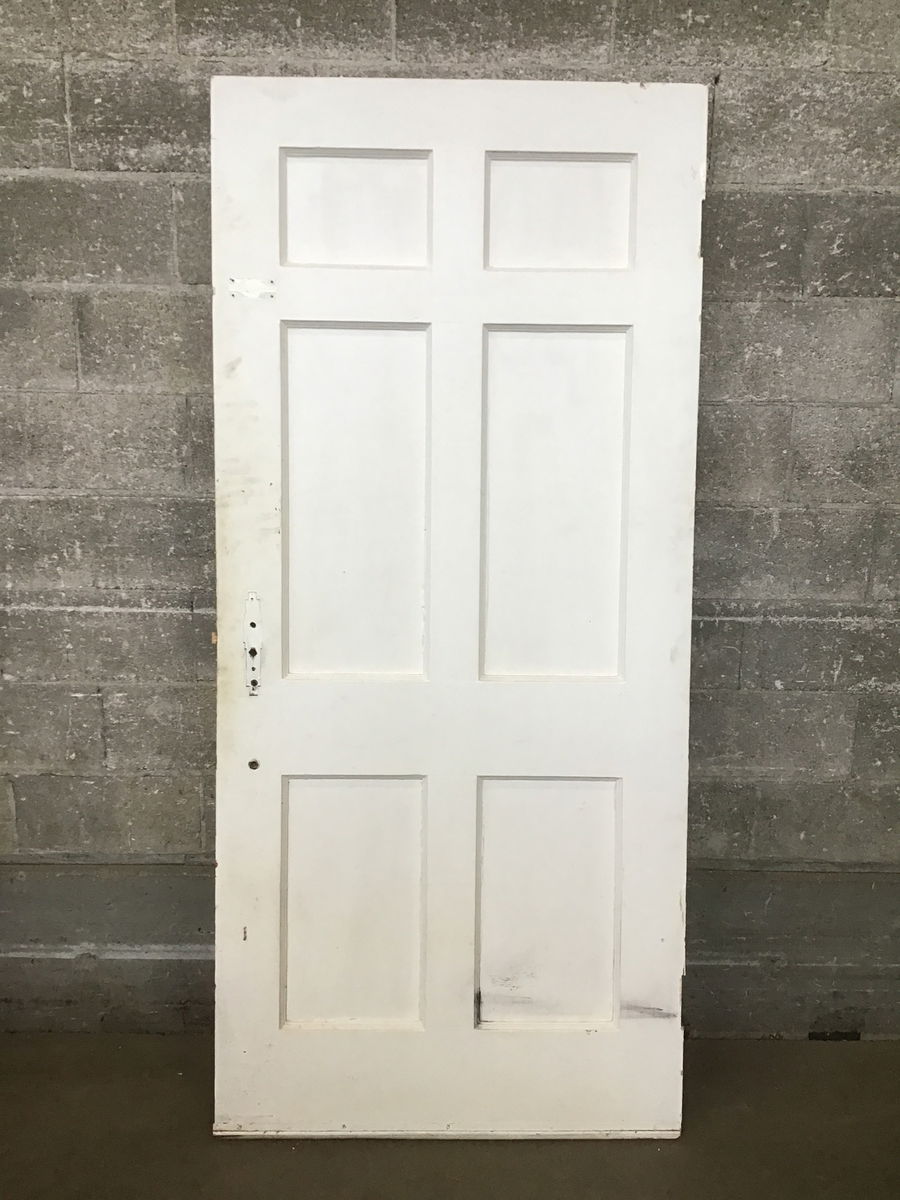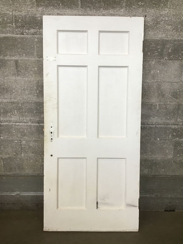 A very bright and sunny painted yellow vintage exterior door. Each side features six beveled panels, on side a coat of yellow and the other a coat of white paint. There is a bit of damage on the yellow side where the knob hardware would go and the price reflects.