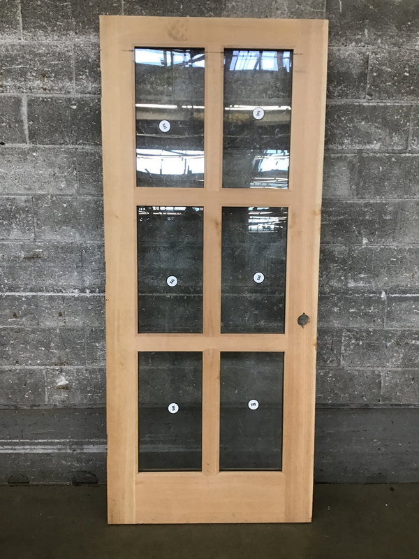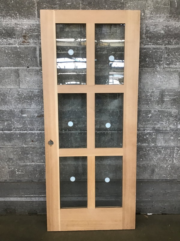 Shaker style six lite door with insulated glass. Looks like it was never installed, but does show some cosmetic blemishes from handling and transport. Price reflects. Note height.
