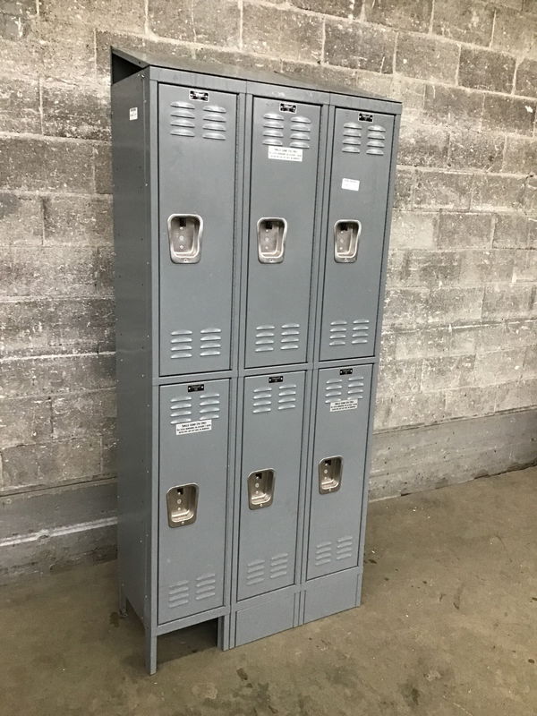 Three doors wide with top and bottom rows of lockers with a sloped top. Dimensions may vary by ~1/4". Item may have cosmetic damage. Photo may be representational.
