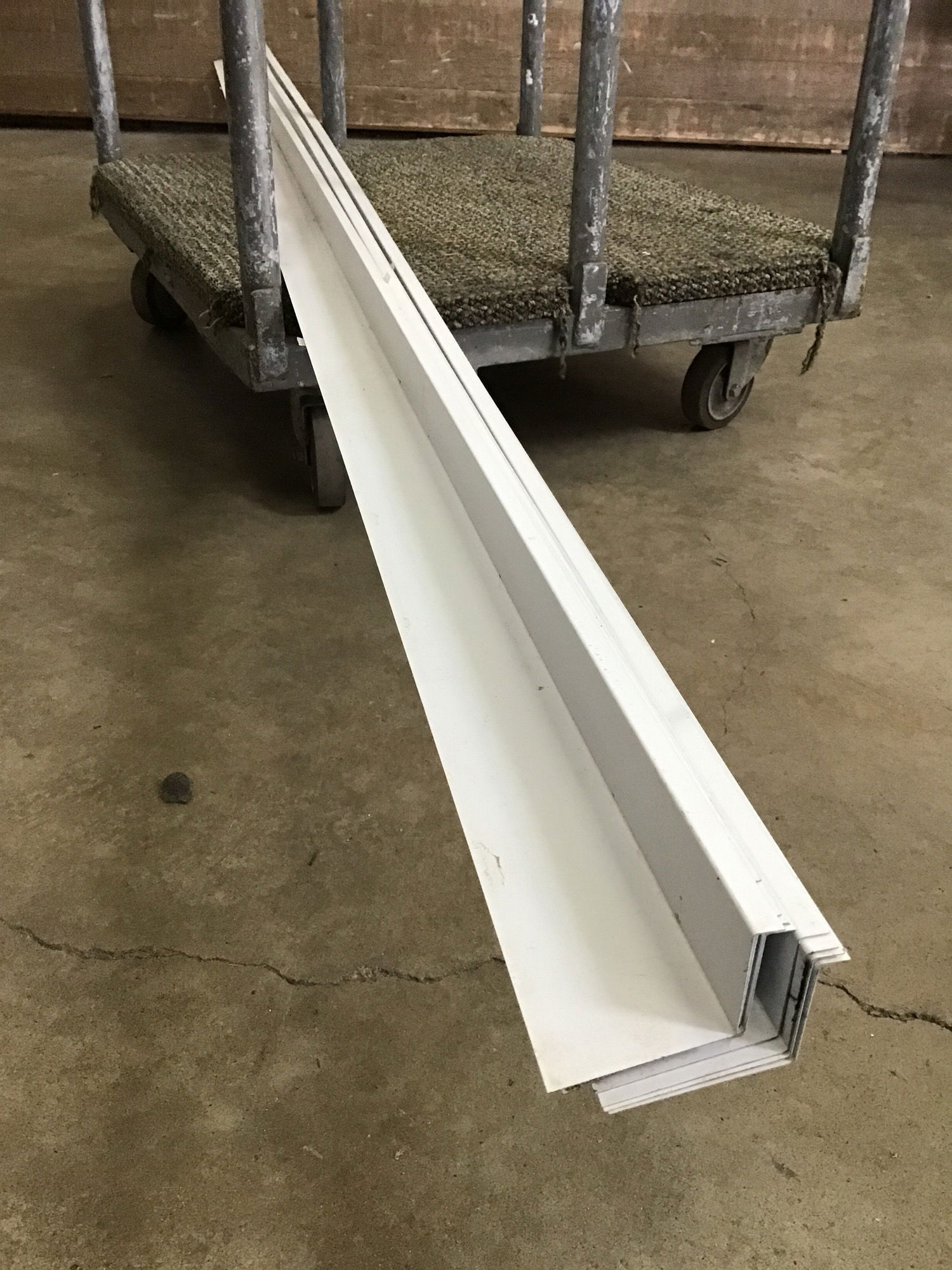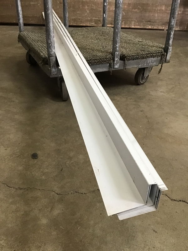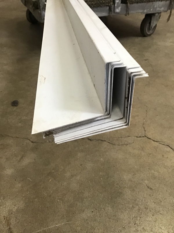 White painted steel roofing flashing with one edge being 4" wide and the other 1.5" wide.