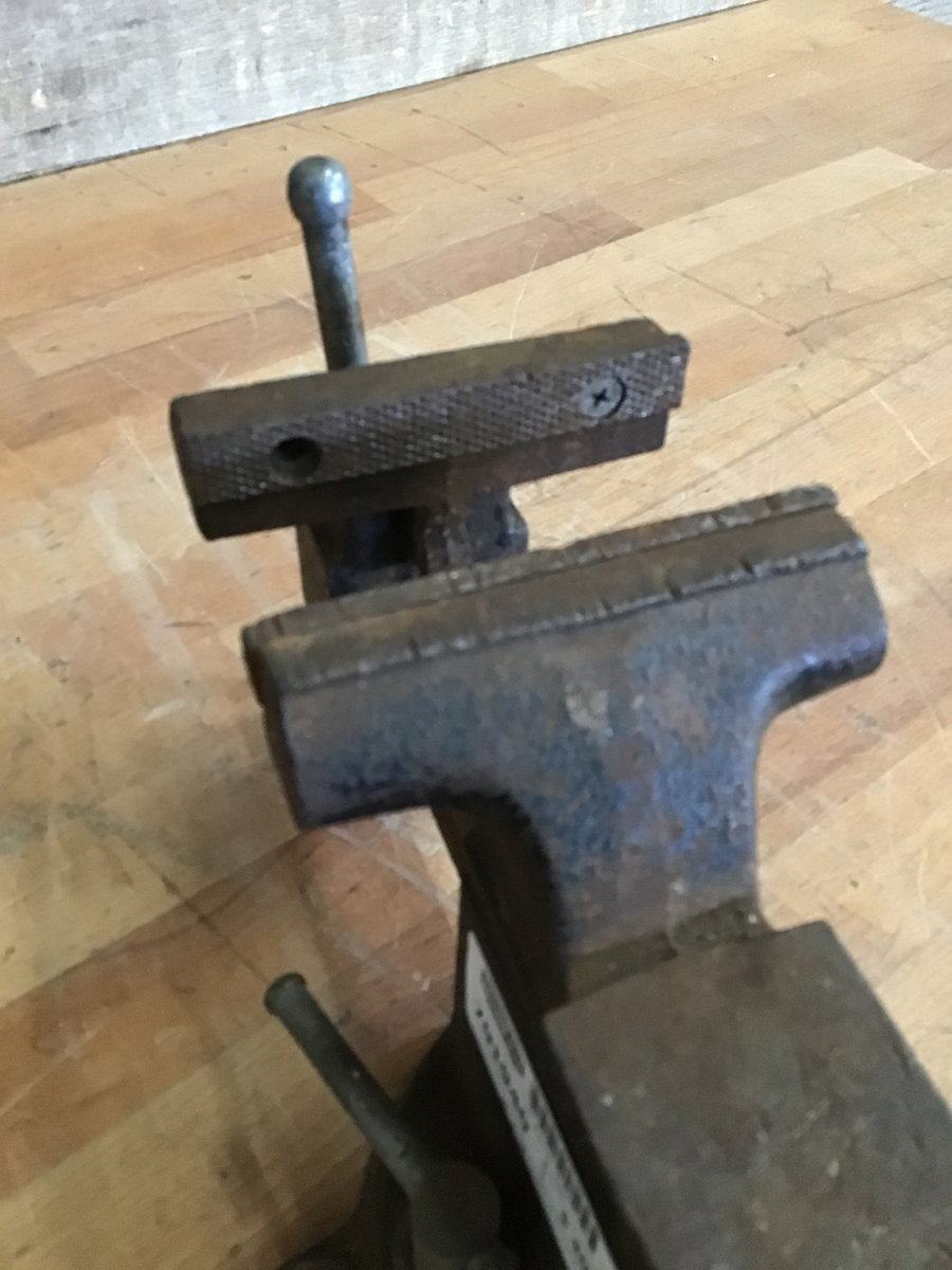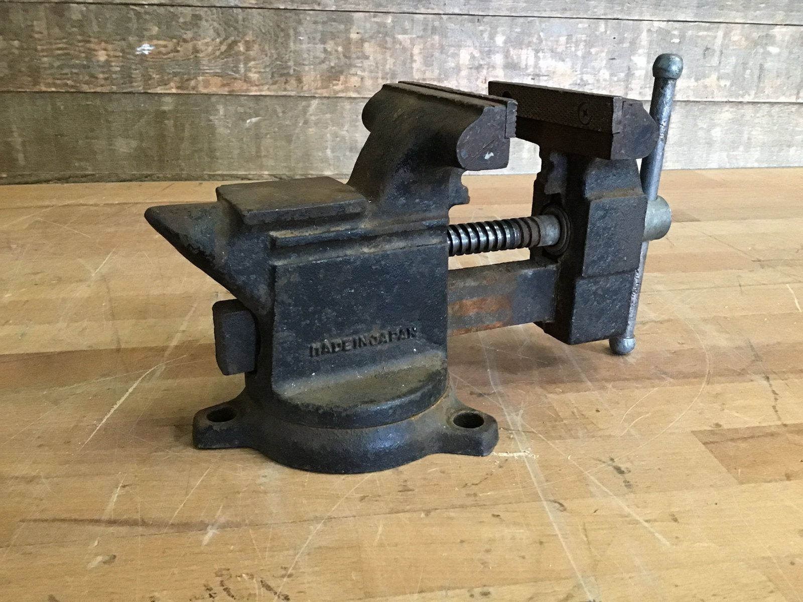 4 inch bench vise, made in Japan. It is missing one screw for one of the grip pads. You can buy a replacement 10-32x1/2 flathead countersunk screw at a hardware store for less than $1.