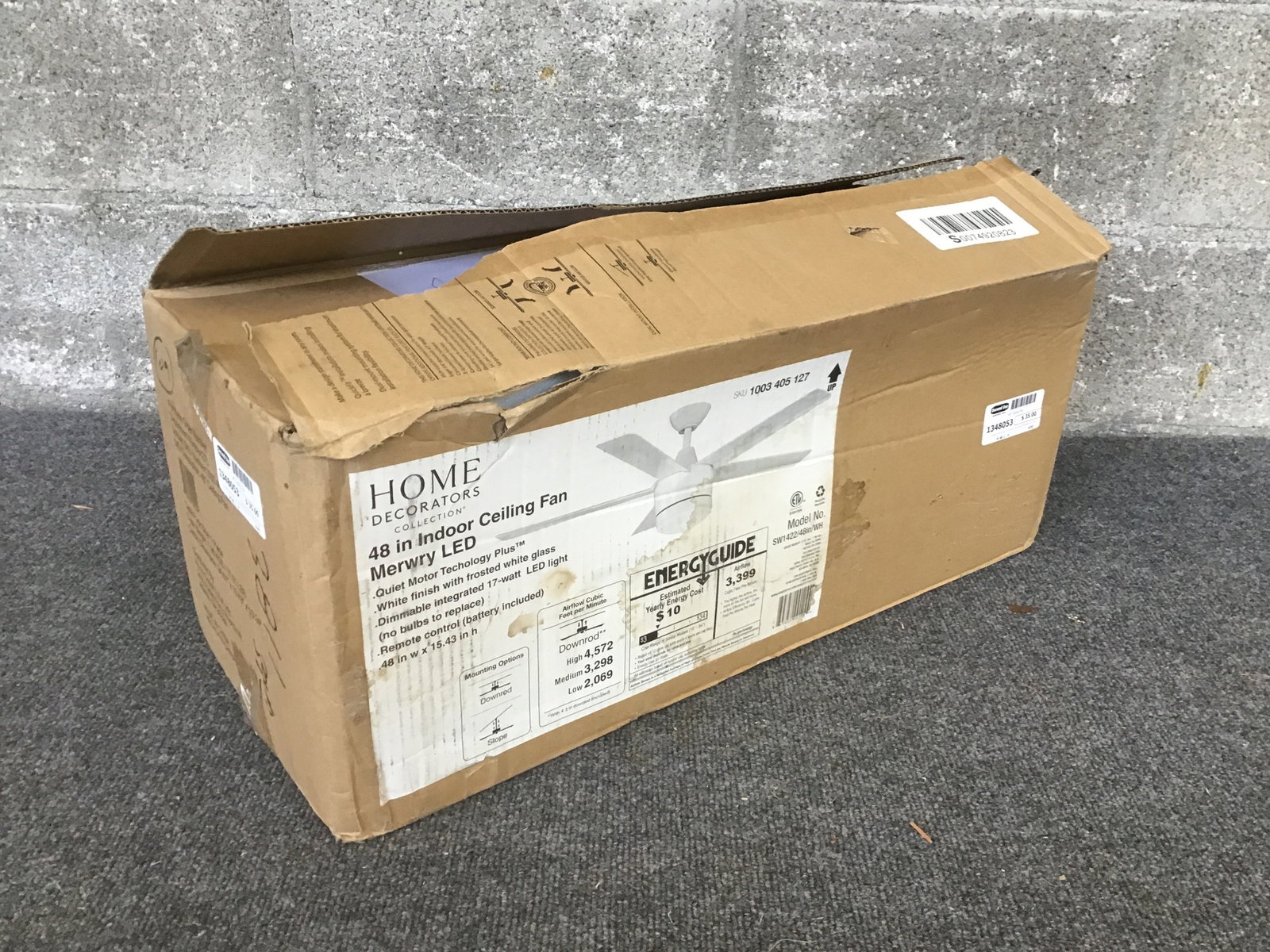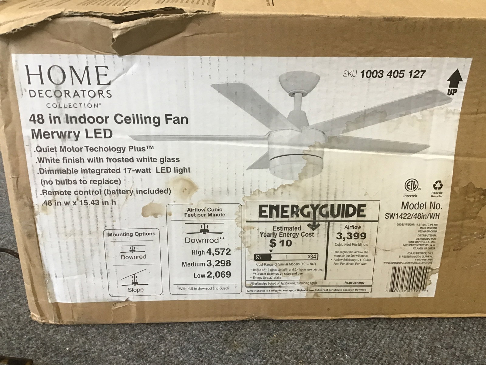 Unused ceiling fan, in original box. Has dimmable LED light and a remote control. Assembly required. Photo is representational. Retails at Home Depot for $99.