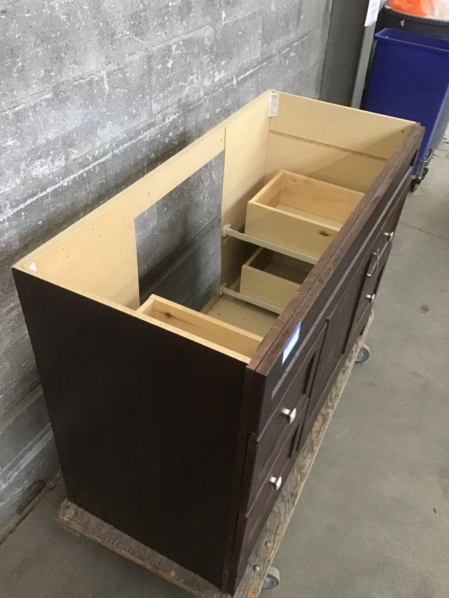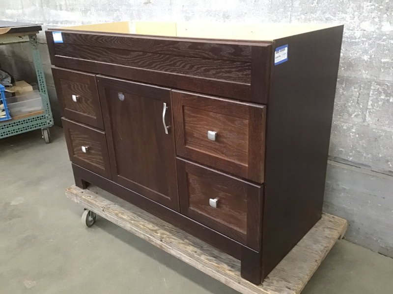 Shakerish style, dark stained oak face vanity that's finished on both sides. This one was a showroom display model, so it's never been installed, but there is some sticker residue on the door panel.