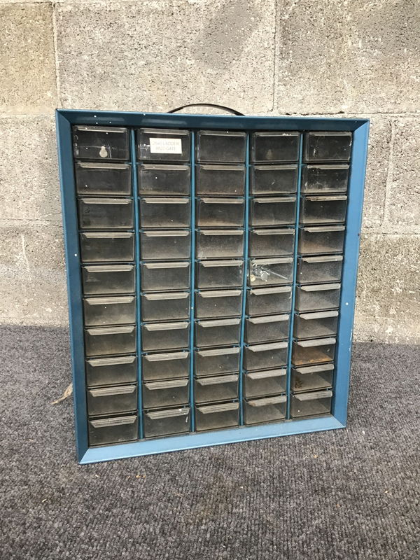 An Akro-Mills parts organizer with 50 drawers... and none of them are missing or broken. WOAHHHHHH