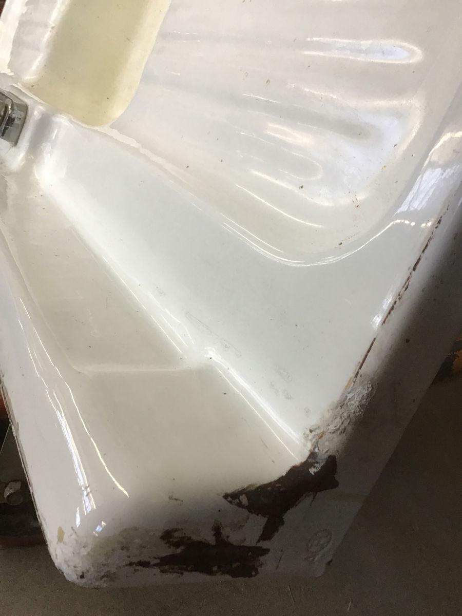 Enameled cast iron sink circa 1953 with double drainboards. It's showing its age a bit, but has sooo much life left in it - would be great in a laundry/mudroom, potting shed or garage, etc!