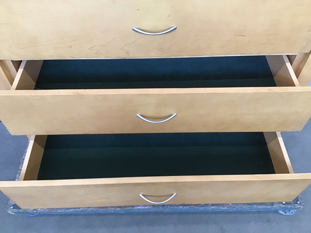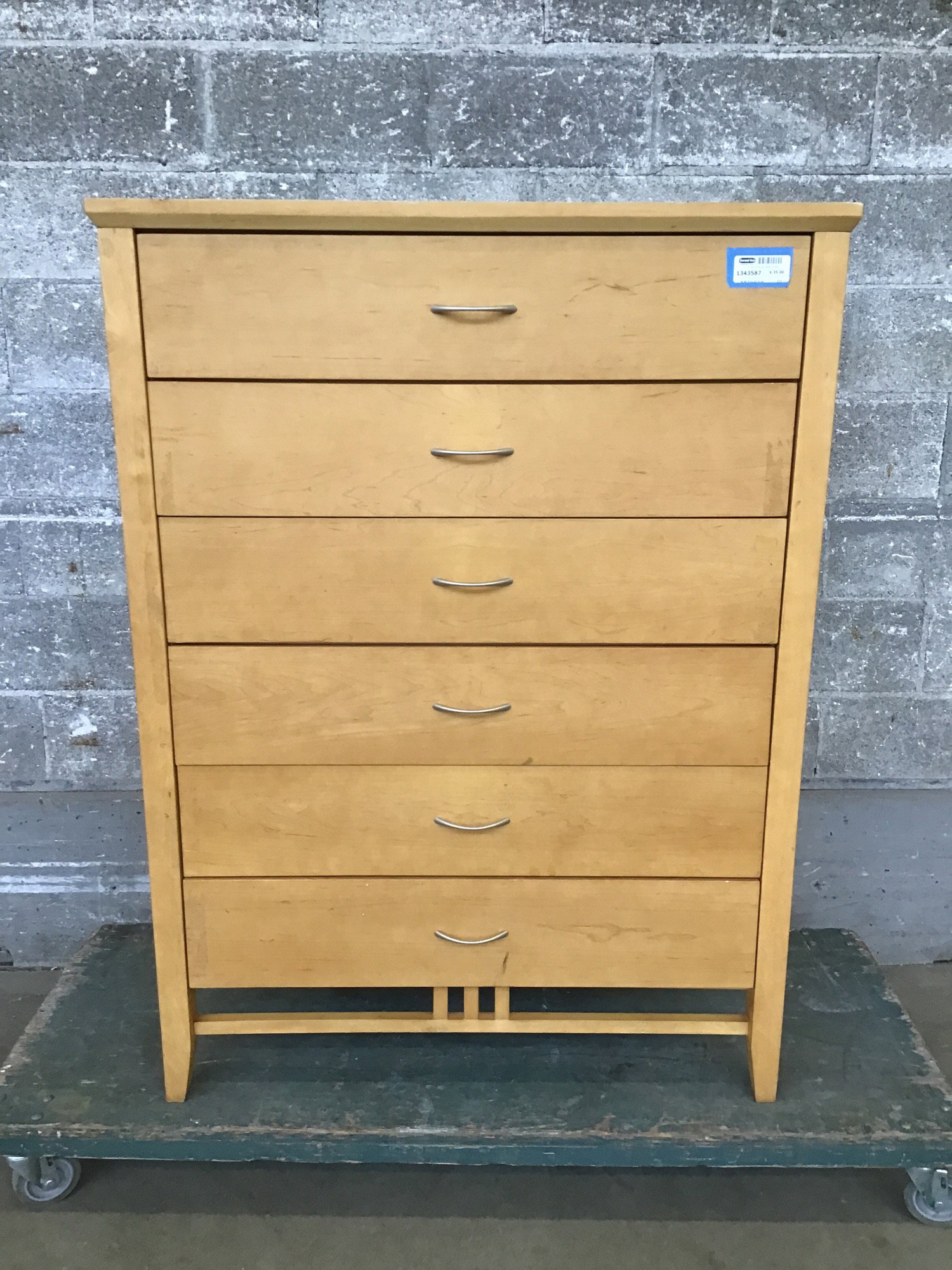 Tall, blonde Maple dresser with 6 drawers. It feels a little cheap but it will get job done. Overall this unit is structurally sound but needs a little cosmetic rehab; there is adhesive residue on the drawer faces, price reflects.