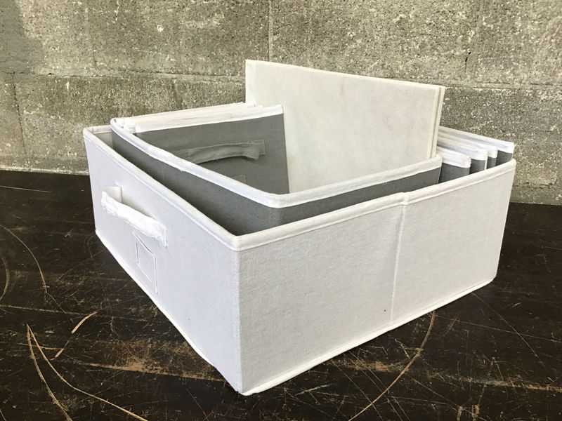 The secret to being organized is just putting everything in baskets. Get organized with this set of six reinforced cloth bins made by Badger Basket Co including three smaller (16.75 x 10.5 x 7") and three larger (19 x 17 x 7") - a perfect height for under your bed. They are clean and look lightly used. They also collapse if you remove the bottom panel. A single similar bin sells at the Container Store for $18.