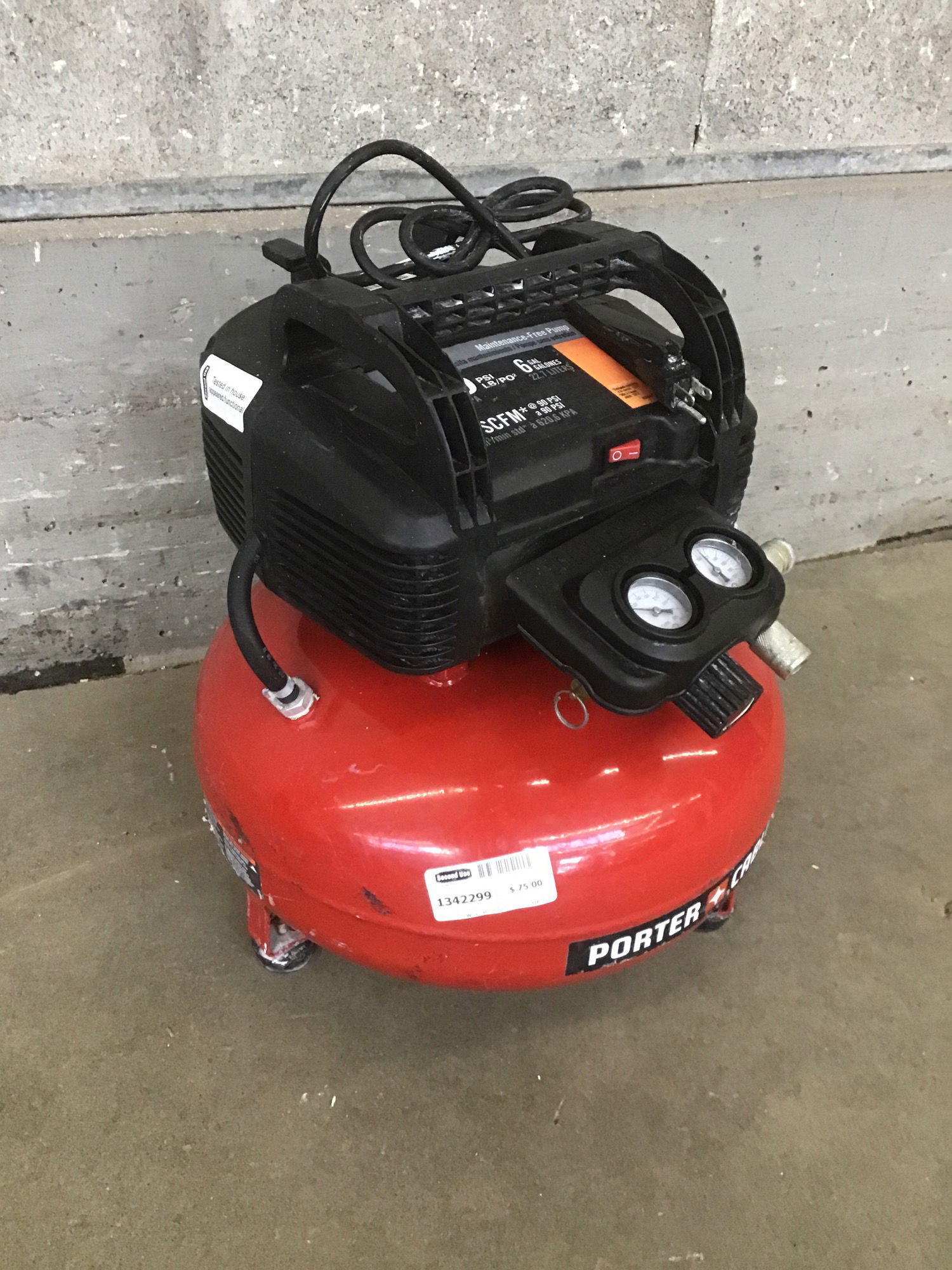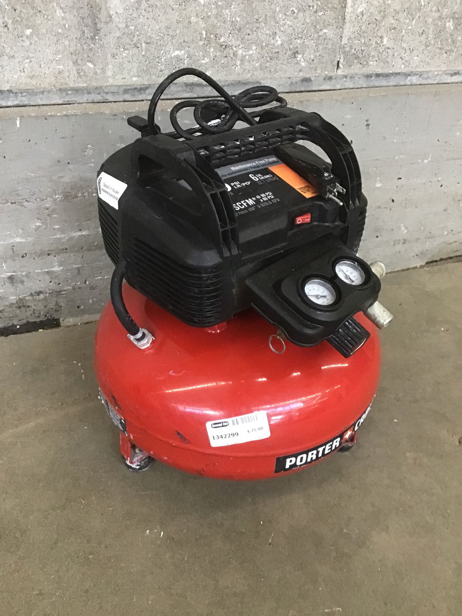 Porter Cable 150psi 6 gallon portable air compressor in good condition. This item was tested in our receiving department and appears functional / the tank held air over night. Full product specs available here.
