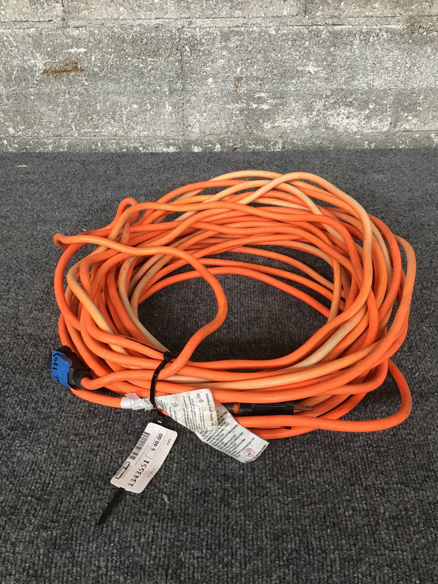A 60' extension cord that looks to be in good condition, with one receiving end.