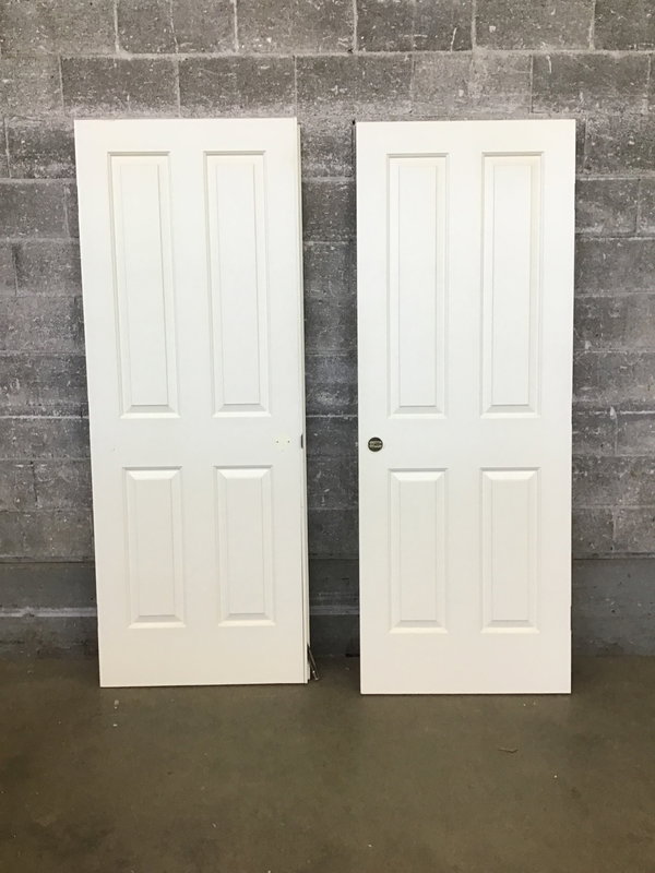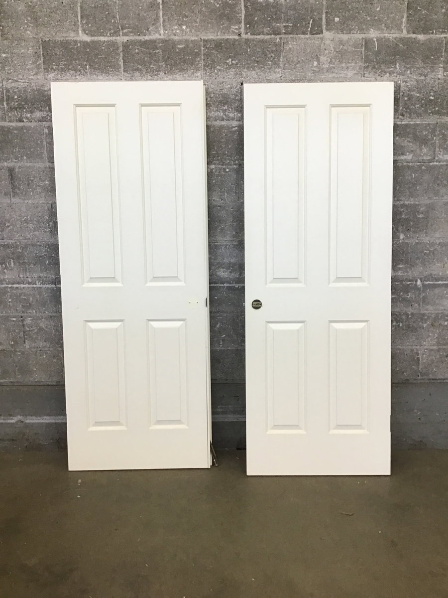 60" Faux Panel Double Doors that each have 4 raised faux panels. Static door has astragal and originally had a dummy knob. Opening door had a normal knob installed.