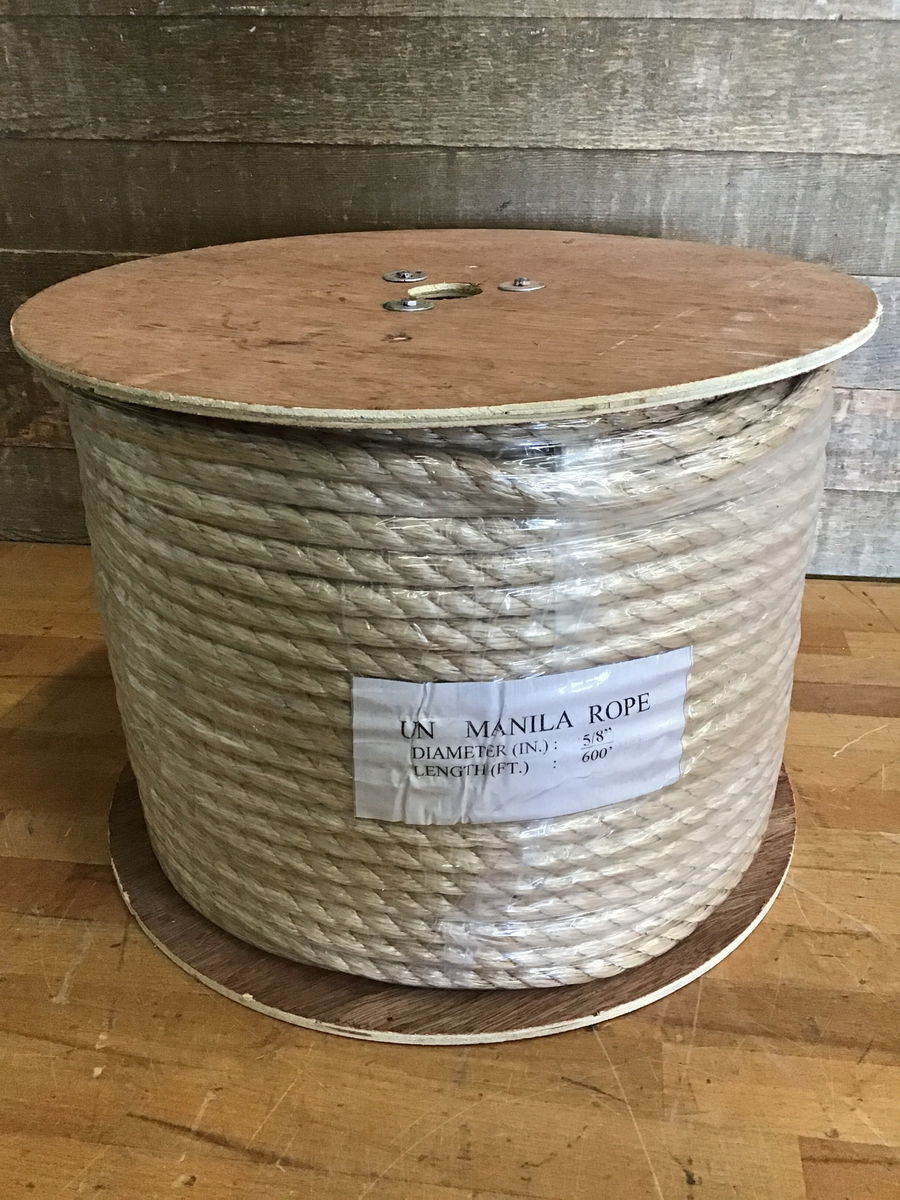 New spool of 600' Un Manila Rope with a 5/8" diameter. This kind of spool sells just under $200 new retail, see here for details. Great for all your rope tying and knot making needs. This is a bulk item, no holds please. Photo may be representative.