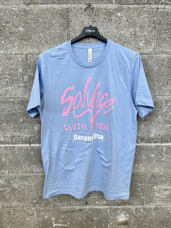 Second Use is the self-proclaimed "World's Queerest Salvage Yard". Show pride for your LGBTQIA community and for reuse in one fell swoop! This baby blue 100% cotton tee has the in-house designed "Salvage With Pride" design printed in pink and white ink. Hand screen printed in Seattle. Unisex size M.