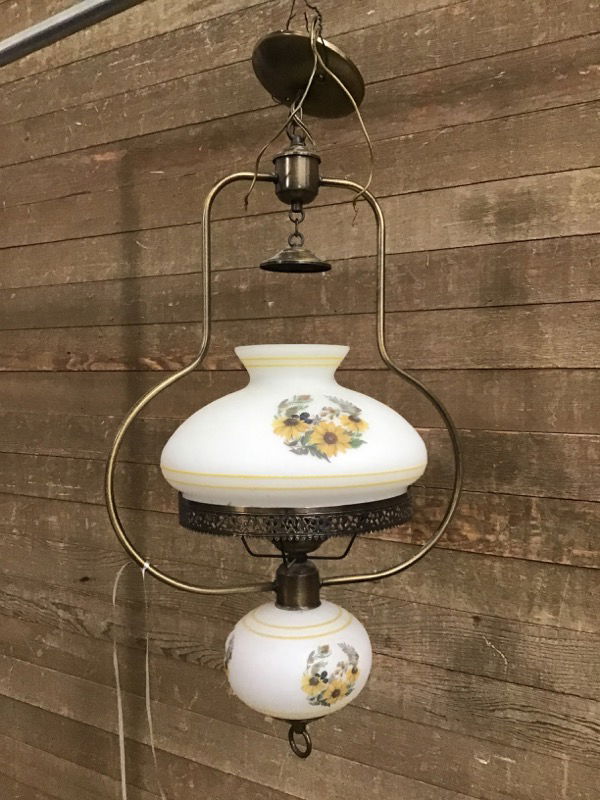 Victorian style oil lamp with single bulb. Features brushed brass frame, and white glass shades decorated with sunflowers and sparkly yellow lines. In nice condition; all ready to be wired up!