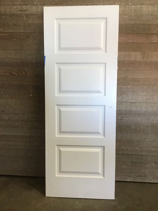 Four panel interior primed masonite door with holes drilled for a faux door handle and set of three 4" hinges. Some cosmetic imperfections that should be too difficult to touch up. Door in great shape otherwise.