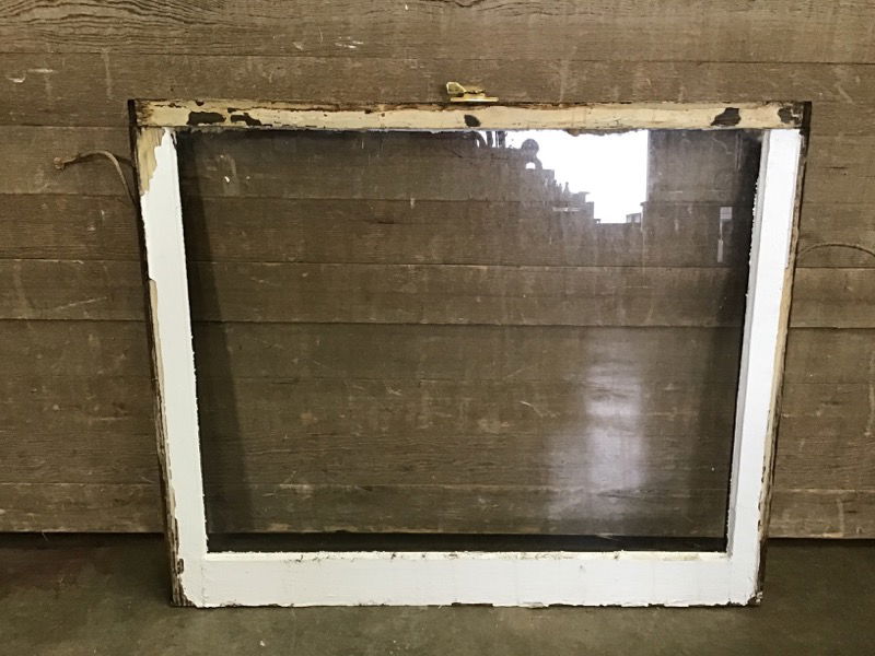 Vintage fir window sash with a beautiful wavy glass pane, coat of white paint on one side. Photo may be representational.