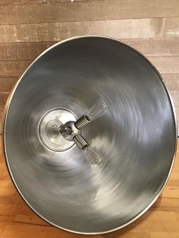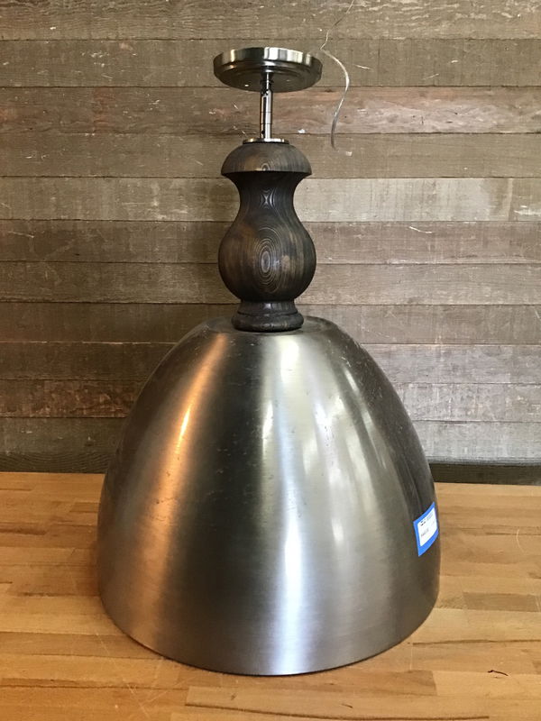 Spectacular Uttermost industrial-chic farmhouse-style ceiling pendant with a spun aluminum finish on the shade and "antique fleck and grey washed wood" at the neck. Holds three bulbs. Retails new for $550.99.