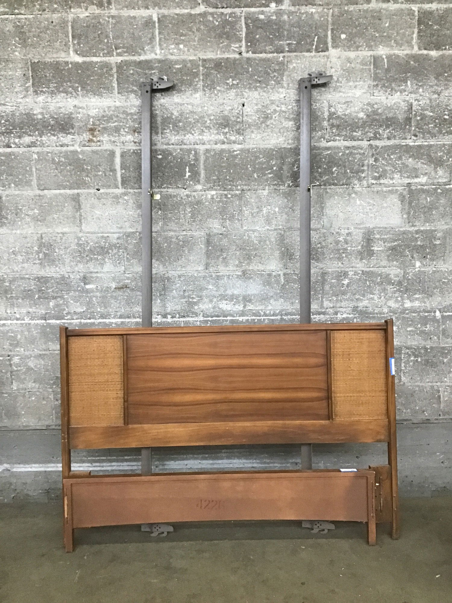 Ca. 1966 Walnut and rattan bed frame that's got a stylish midcentury vibe going on. Comes with its steel rails (slots to lock them in are 54" apart, but actual width of headboard is listed and about queen size. Stenciled on the back 4226-50-43_-X-66