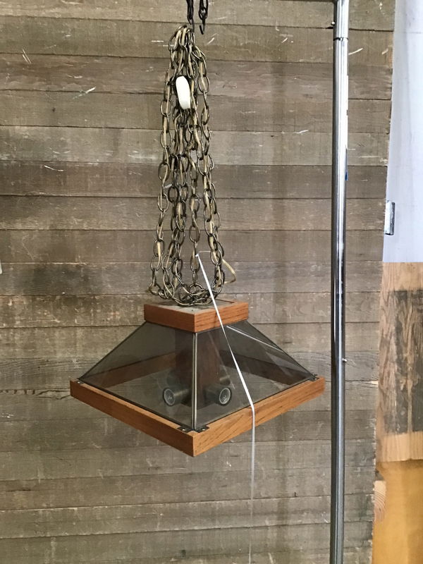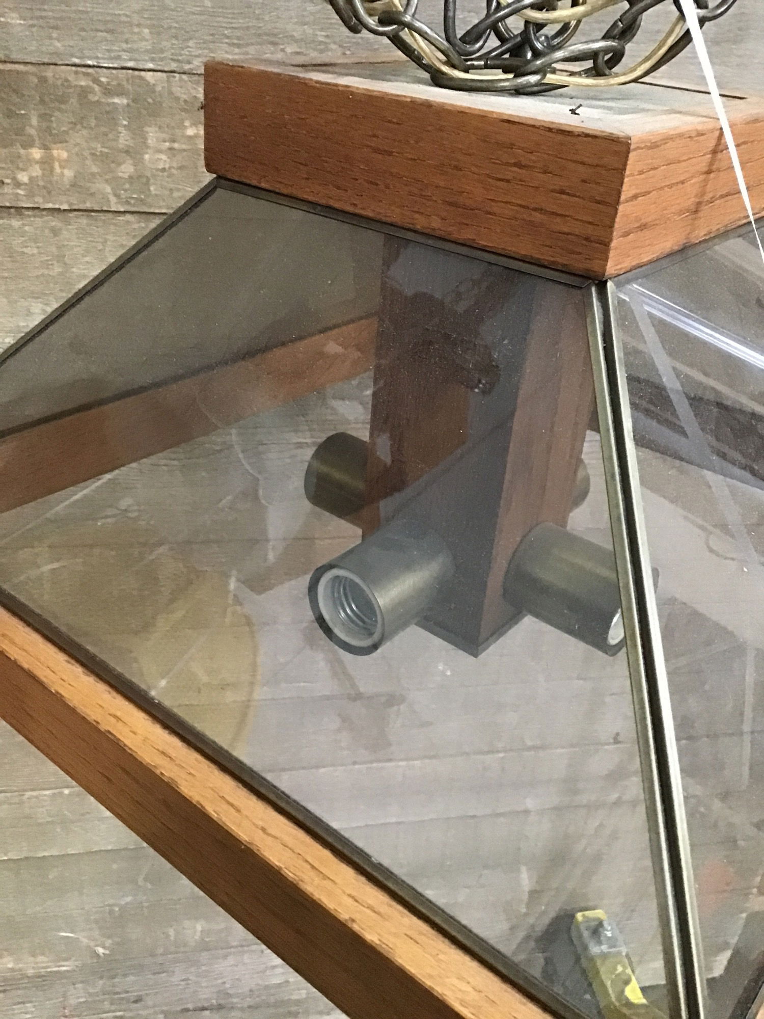 MCM oak and smokey glass 4-light swag light with a brass finish. The chain is about 14ft with a plug in and switch on the cord. Looks to be in overall good condition!